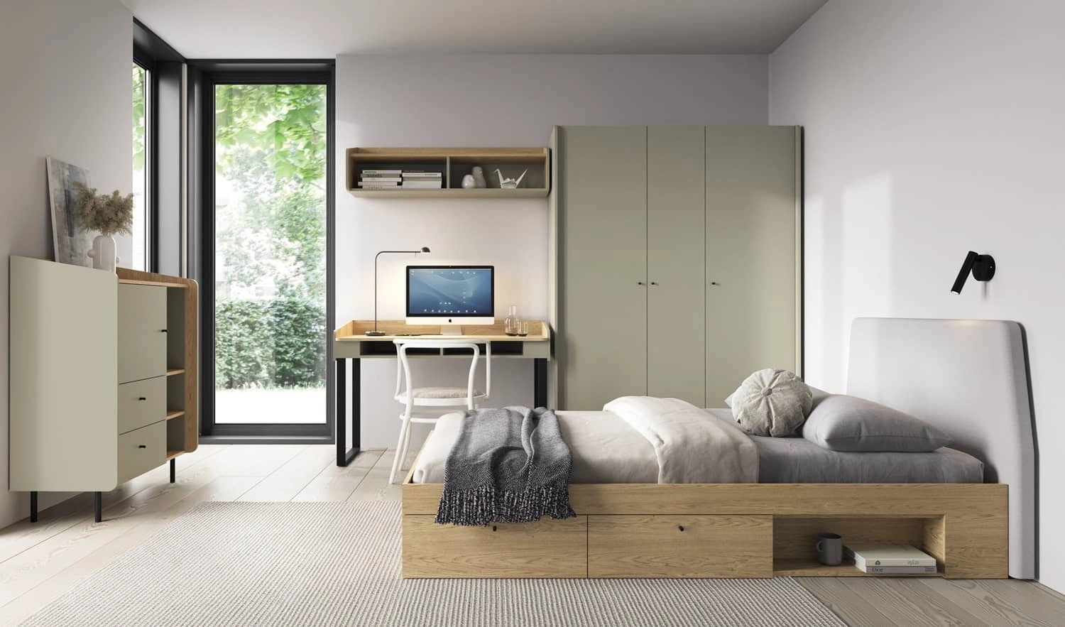 Nábytková sestava Olivio eukalyptus / dub baltický dune ideální do dětského pokoje nebo pokoje pro mladé v módním stylu