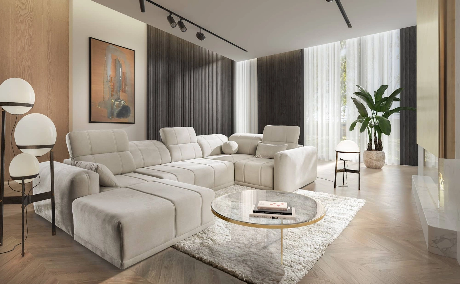 Rohová pohovka Cetara IV v béžové barvě je mimořádně funkční kus nábytku se stylovou povrchovou úpravou.
