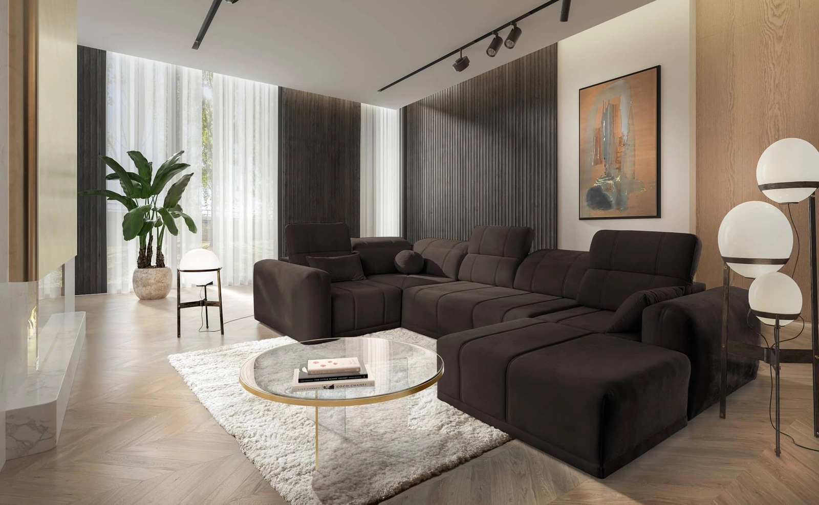 Rohová pohovka Cetara IV v hnědé barvě je mimořádně funkční kus nábytku se stylovou povrchovou úpravou.