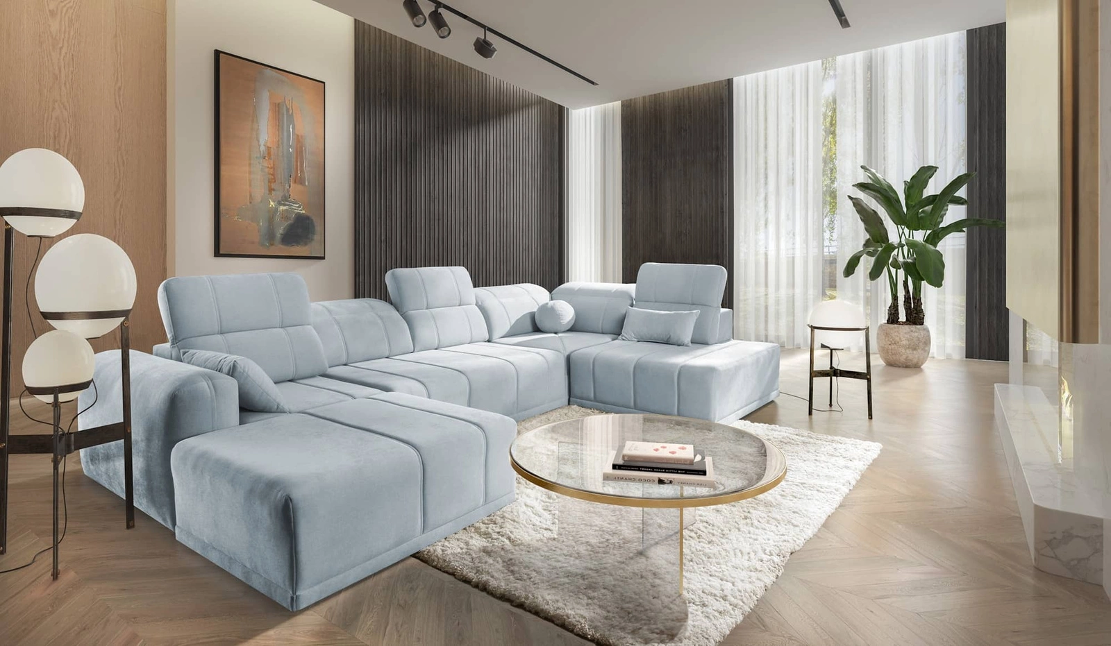 Rohová pohovka Cetara VI v modré barvě je vysoce funkční kus nábytku se stylovou povrchovou úpravou.