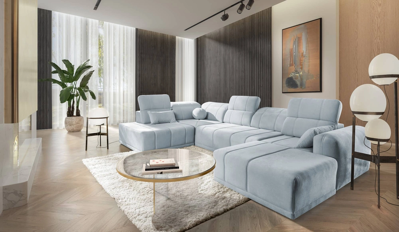 Rohová pohovka Cetara VI v modré barvě je vysoce funkční kus nábytku se stylovou povrchovou úpravou.