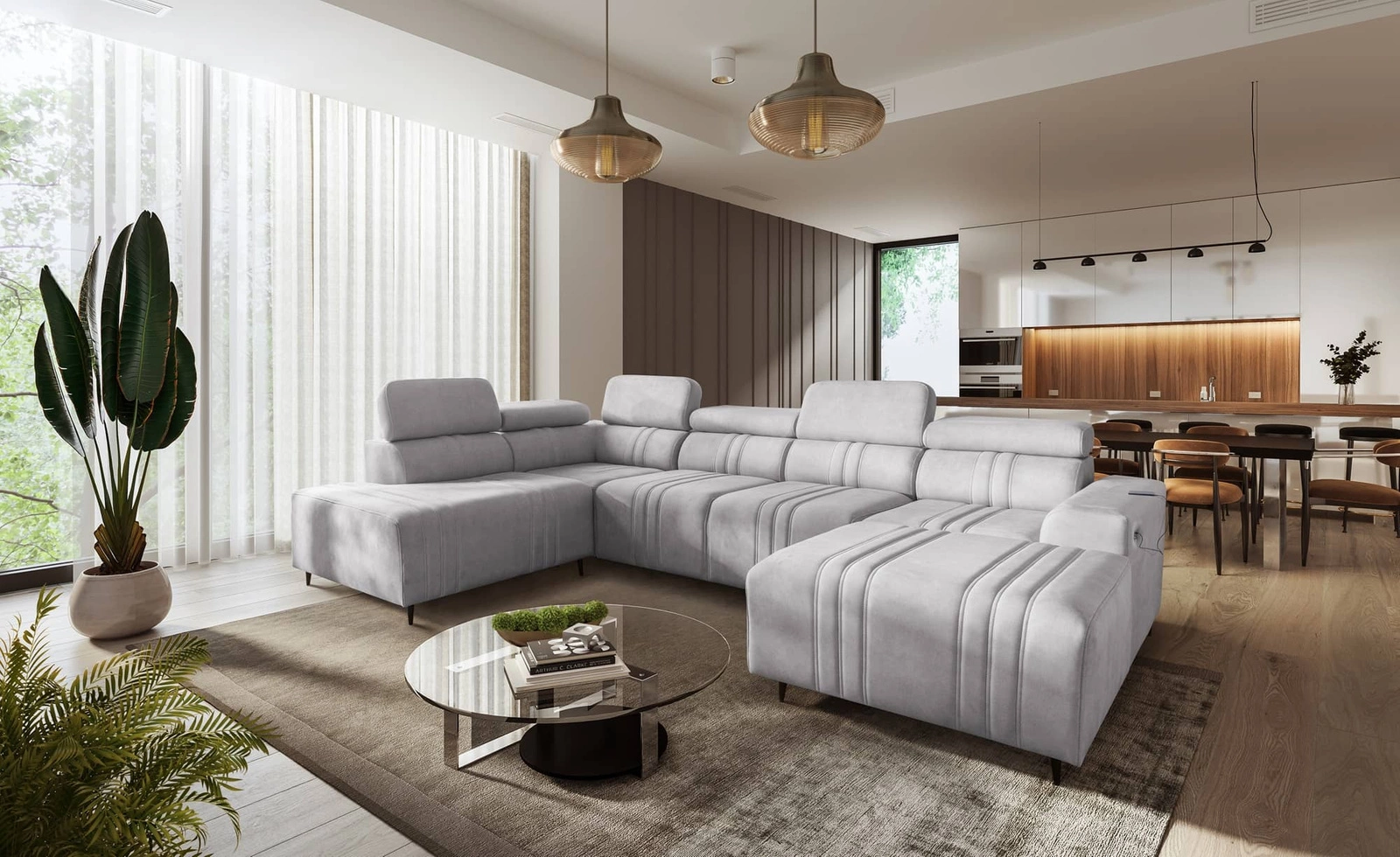 Mezi doplňky tohoto nábytku, které ocení všichni uživatelé, patří dva kontejnery na lůžkoviny, nastavitelné opěrky hlavy a nabíjecí zásuvka USB na boku rohové skříně.
