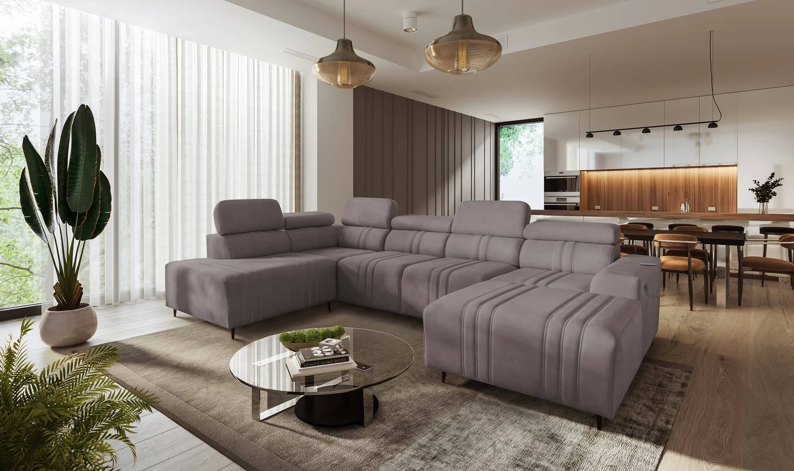 Rohová jednotka Castel VI v šedohnědé barvě s nastavitelnými opěrkami hlavy je mimořádně elegantní kus nábytku se zajímavou povrchovou úpravou.