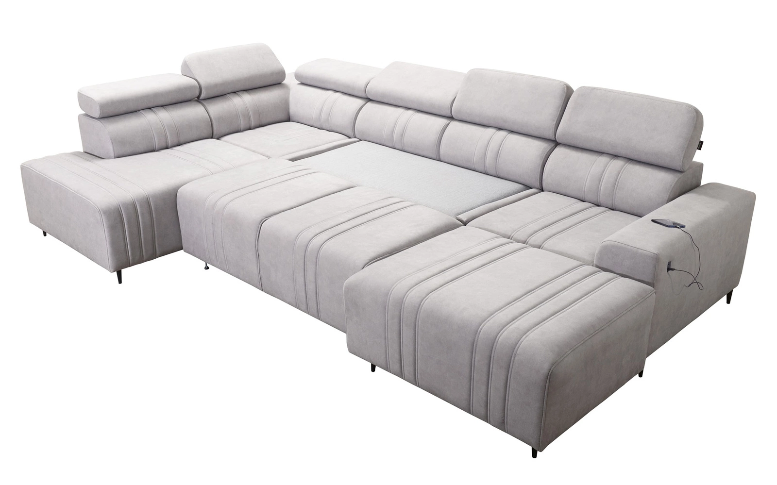 Mezi doplňky tohoto nábytku, které ocení všichni uživatelé, patří dva kontejnery na lůžkoviny, nastavitelné opěrky hlavy a nabíjecí zásuvka USB na boku rohové skříně.