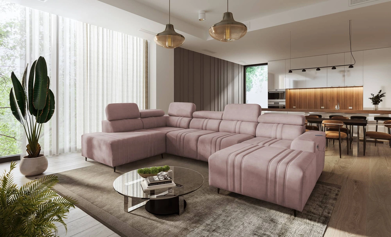Rohová jednotka Castel VI v růžové barvě s nastavitelnými opěrkami hlavy je mimořádně elegantní kus nábytku se zajímavou povrchovou úpravou.
