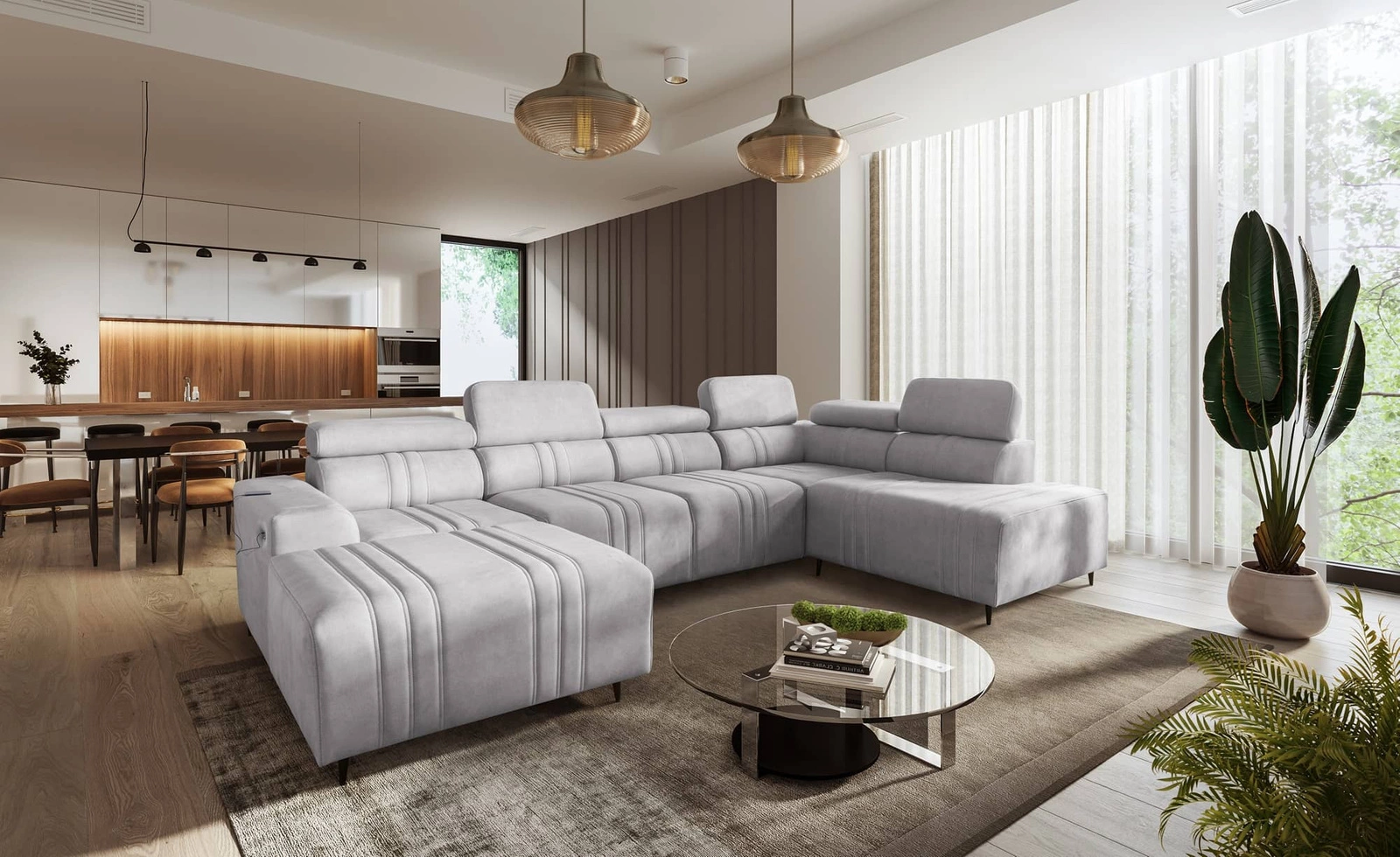 Mezi doplňky tohoto nábytku, které ocení všichni uživatelé, patří dva kontejnery na lůžkoviny, nastavitelné opěrky hlavy a nabíjecí zásuvka USB na boku rohové skříně.