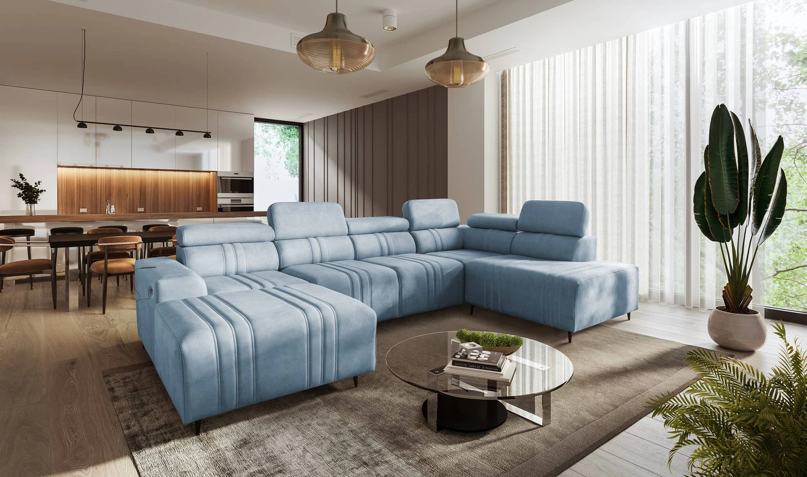 Rohová jednotka Castel VI v modré barvě s nastavitelnými opěrkami hlavy je mimořádně elegantní kus nábytku se zajímavou povrchovou úpravou.
