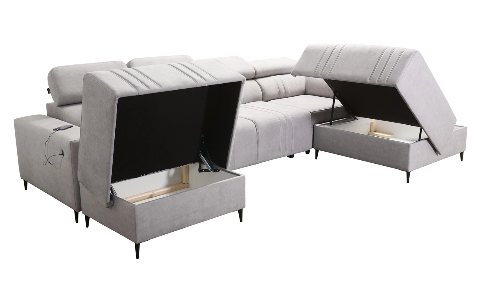 Mezi doplňky tohoto nábytku, které ocení všichni uživatelé, patří dva kontejnery na lůžkoviny, nastavitelné opěrky hlavy a nabíjecí zásuvka USB na boku rohové skříně.