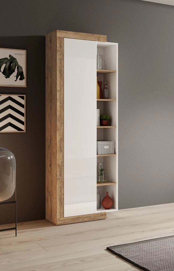 Přední části dokončené v vysoký lesk jsou vyrobeny z vysoce kvalitní nábytkové desky o tloušťce 15 mm. Knihovna v obývacím pokoji je vyrobena z 1 dvířka a otevřené police. Vitríny z kolekce Sintra se díky svému originálnímu tvaru a univerzálnosti skvěle hodí jako vitríny do obývacího pokoje, jídelny nebo knihovny.