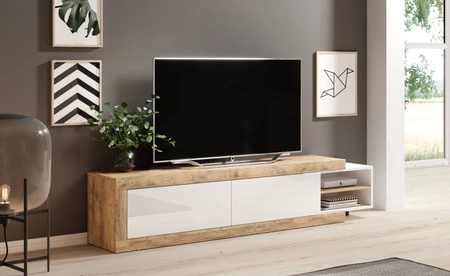 TV skříňka Sintra vytvořeno pro módní a moderní interiéry. Solidní zpracování a originální tvar masivu vnesou do každého interiéru jedinečnou atmosféru. Dubové zbarvení v kombinaci s bílou se skvěle hodí do skandinávských i modernějších aranžmá. Charakteristické prvky kolekce Sintra je to podstavce pod nábytek a robustní pracovní desky o tloušťce 32 mm. Tento nádherný kus nábytku se zvláštním a jedinečným charakterem dodává nápadné dekoraci jemnost a eleganci.