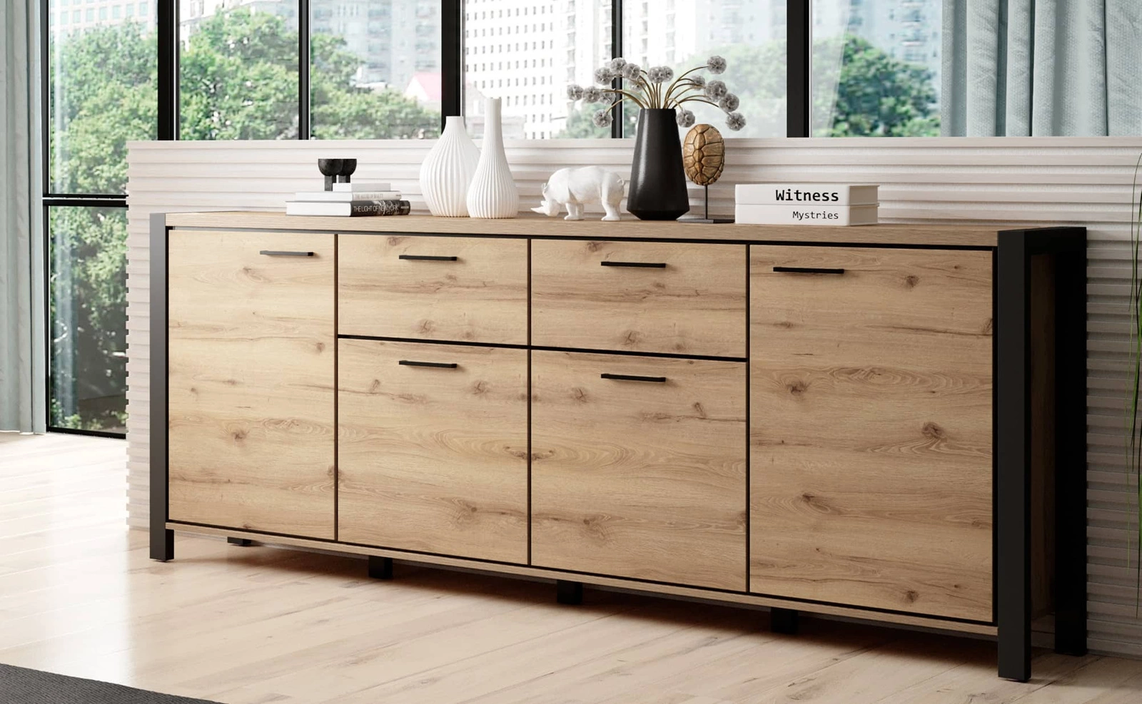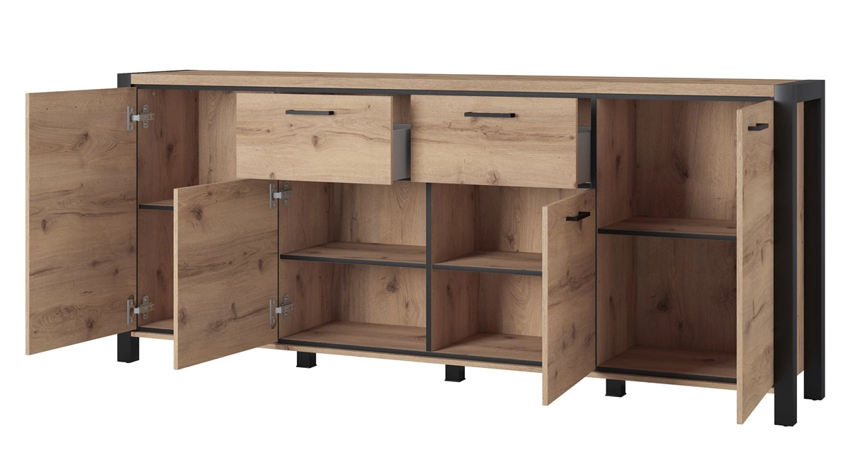 Komoda je zkonstruována 4 dveře a 2 zásuvky vysouvání na kuličkových ložiscích. Zásuvky jsou navíc vybaveny plně výsuvným systémem, což usnadní přístup. Použitý systém zvyšuje komfort a bezpečnost používání nábytku. Teplé dubové zbarvení dodává místnosti světlý a útulný nádech, díky čemuž se v ní komoda Aktiv se zásuvkami je ideální jako komoda do obývacího pokoje nebo jako komoda do obývacího pokoje. Komodu lze s úspěchem použít také jako kancelářskou komodu nebo komodu do ložnice.