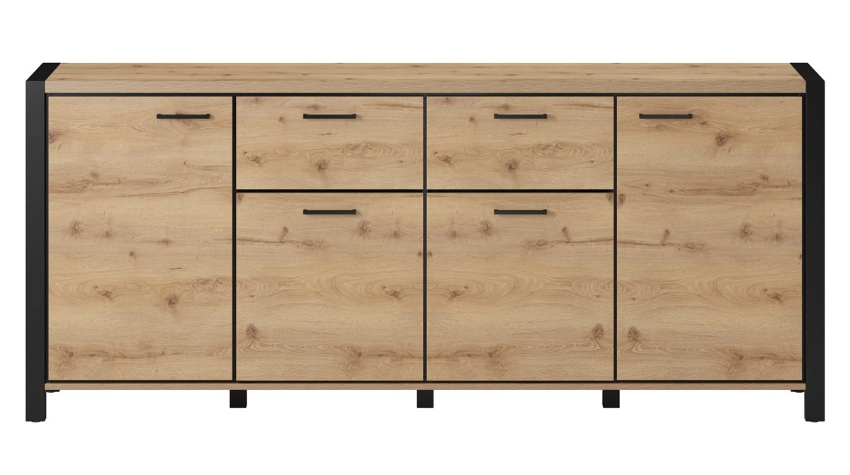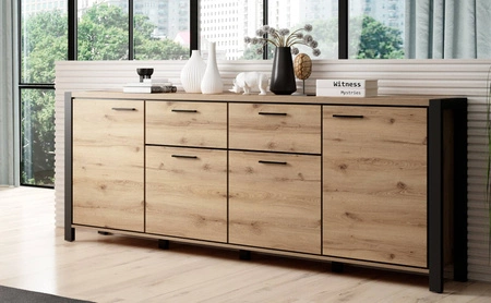 Komoda Aktiv je ideálním nábytkem do moderních interiérů v jasných barvách i do tlumenějších industriálních prostor. Přítomnost komody se stane stylovou tečkou na závěr místnosti a dodá jí zvláštní charakter. Barevné fronty dub taurus byly vylepšeny kovové rukojeti v černé barvě. Ozdobný rám okolí korpus komody působí velmi působivě a elegantně. Robustní 32 mm silné horní desky je dalším vrcholem kolekce Aktiv.