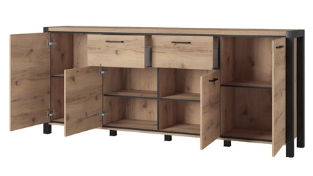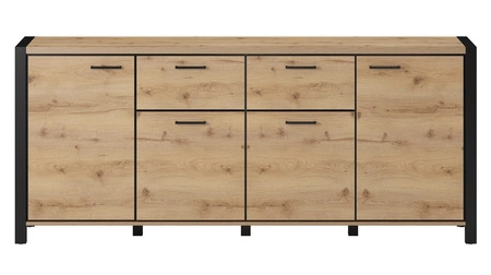 Komoda je zkonstruována 4 dveře a 2 zásuvky vysouvání na kuličkových ložiscích. Zásuvky jsou navíc vybaveny plně výsuvným systémem, což usnadní přístup. Použitý systém zvyšuje komfort a bezpečnost používání nábytku. Teplé dubové zbarvení dodává místnosti světlý a útulný nádech, díky čemuž se v ní komoda Aktiv se zásuvkami je ideální jako komoda do obývacího pokoje nebo jako komoda do obývacího pokoje. Komodu lze s úspěchem použít také jako kancelářskou komodu nebo komodu do ložnice.