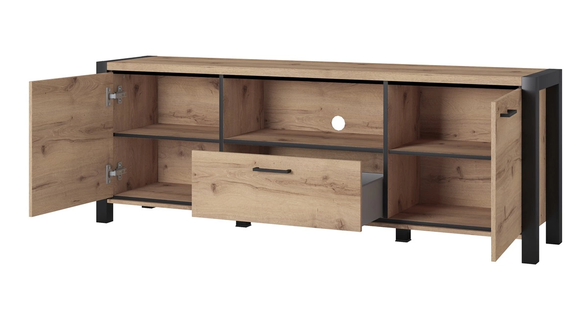 Zásuvky nábytku se vysouvají na kuličkových ložiskových pojezdech. Zásuvky jsou navíc vybaveny plně výsuvným systémem, což usnadní přístup. Použitý systém zvyšuje komfort a bezpečnost používání nábytku. Teplé dubové zbarvení dodává místnosti světlý a útulný nádech, díky čemuž se v ní nábytek do obývacího pokoje Aktiv je ideální pro jako závěsná skříňka do obývacího pokoje s originálním designem povrchovou úpravou nebo obývací stěna v industriálním stylu.