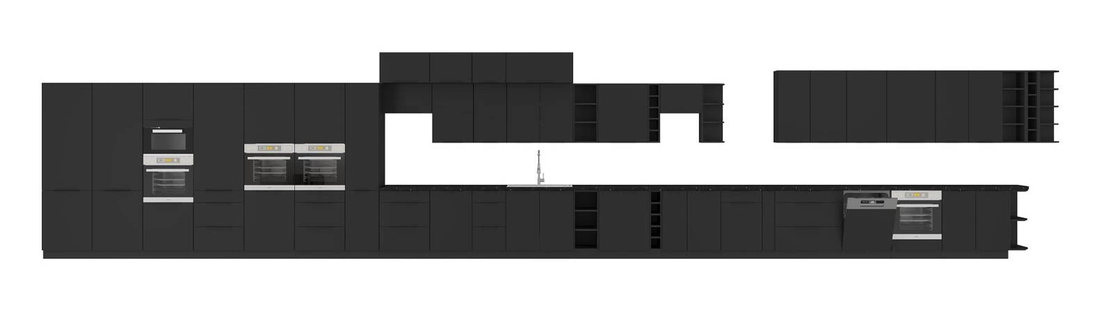 Dvířka kuchyňských skříněk v černé barvě s matným povrchem byly vyrobeny z laminovaná deska. Přední strana je vysoce odolná proti vlhkosti a náhodnému poškození. Stylovým doplňkem přední části kuchyňské linky je panel černá, kovová hrana rukojeti, který kromě své primární funkce dodává zvláštní nádech.