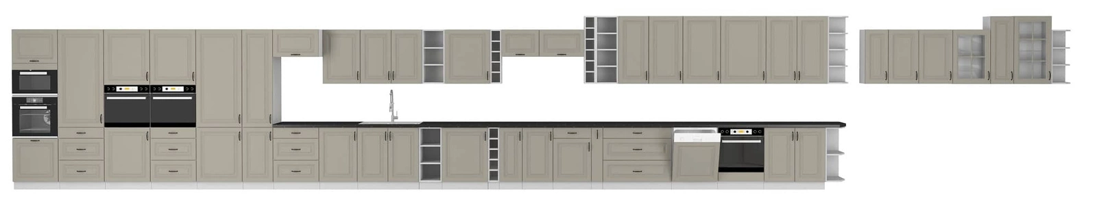Šedobéžová čela kuchyňských dřezových skříněk jsou vyrobena z mDF desky a skončil s stylové frézování. Hrany čel kuchyňských skříněk jsou chráněny dýhou ABS, která má dvě funkce. Je to zabezpečení proti vlhkosti a chrání proti náhodnému poškození. Stylovým doplňkem čel kuchyňských skříněk je černé rukojeti, které kromě své hlavní funkce dodávají nábytku zvláštní charakter.