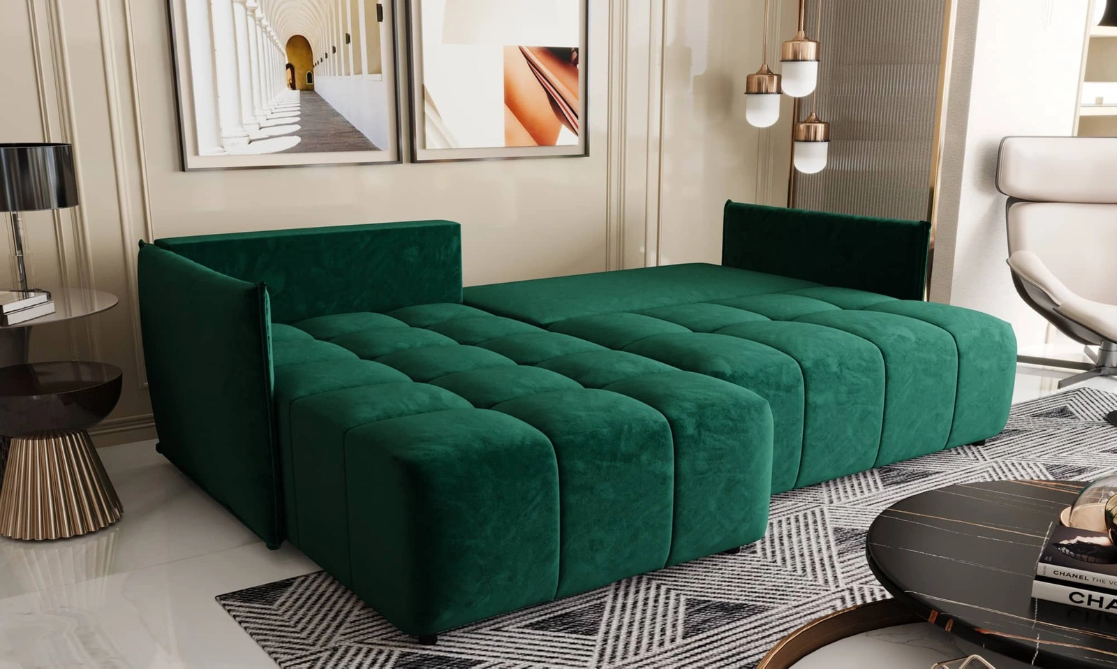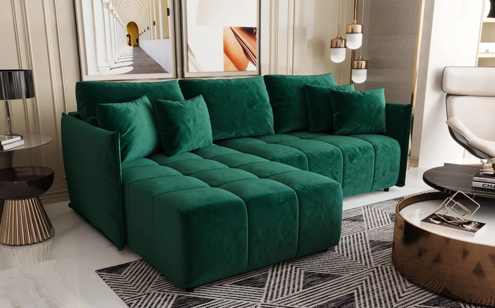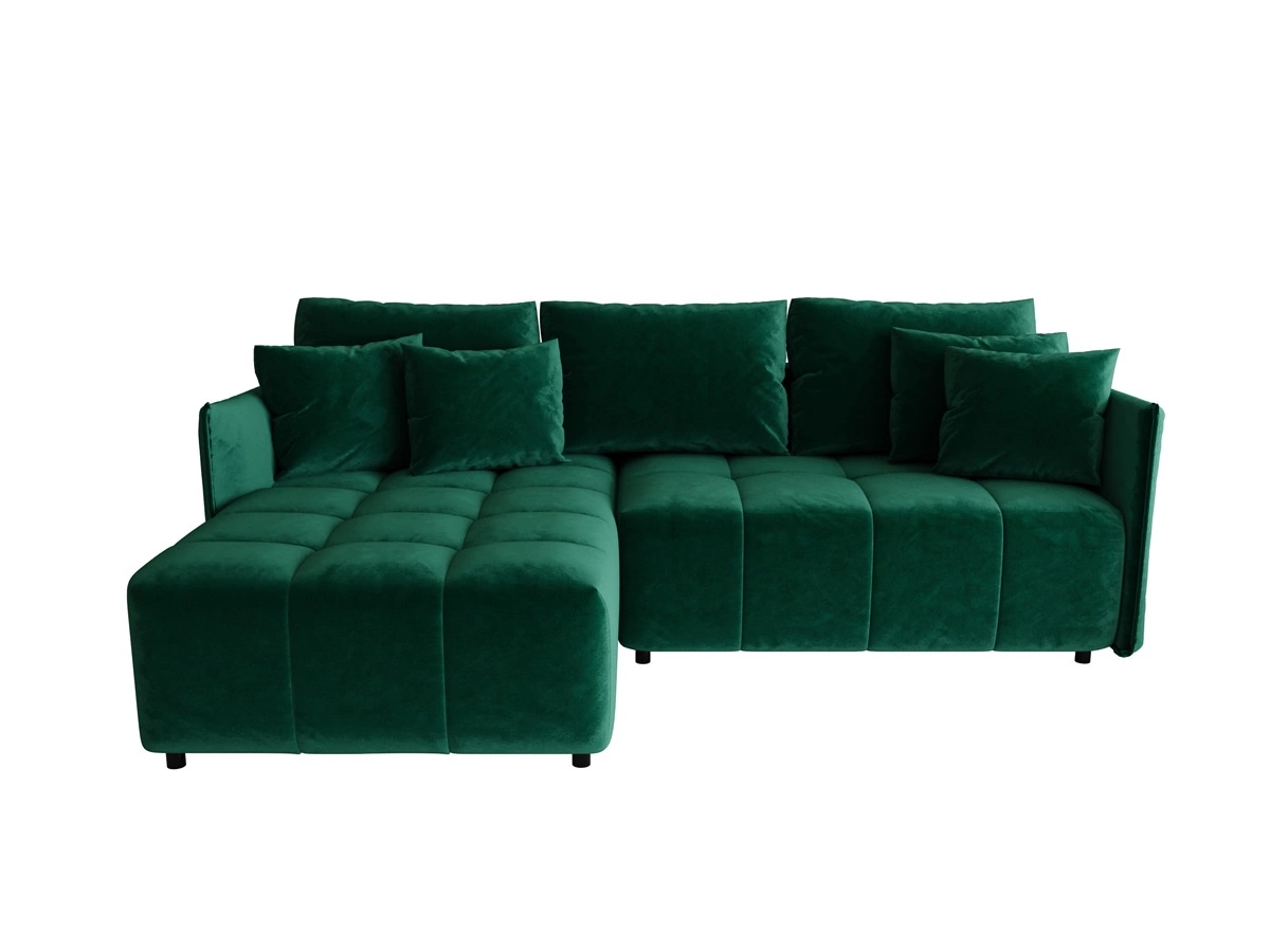 Rozkládací pohovka Oroso bottle green levá pohovka měkká sametová tkanina s hydrofobním povlakem nádoba na lůžkoviny