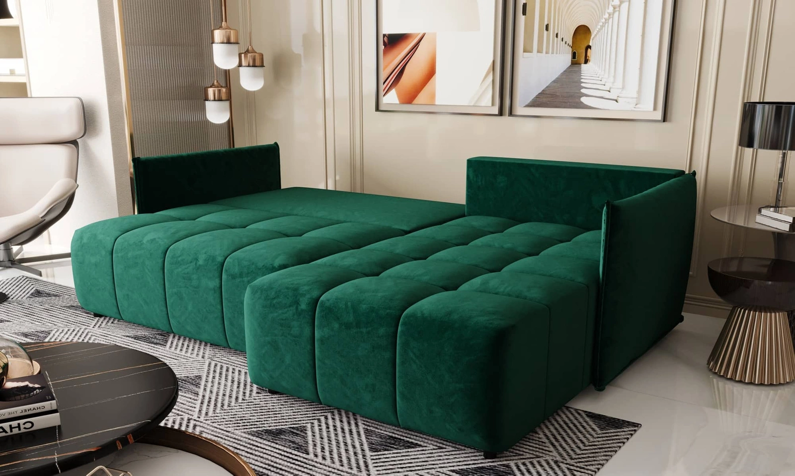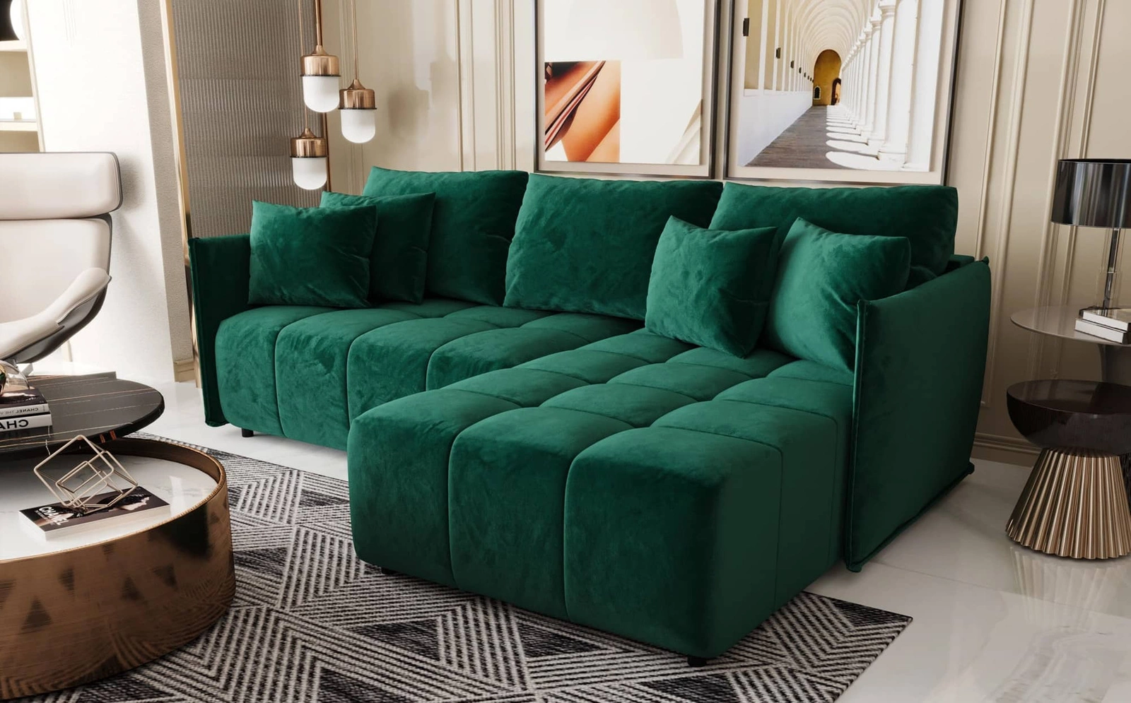 Rohová pohovka Oroso v lahvově zelené barvě je atraktivní kus nábytku, který si snadno najde místo v každé místnosti vašeho domova.