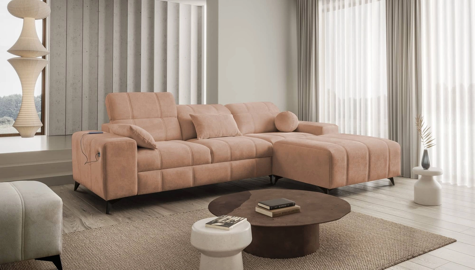 Rohová pohovka Penejos v lososové barvě s nastavitelnými opěrkami hlavy je nádherný kus nábytku se zárukou nejvyššího pohodlí a funkčnosti.