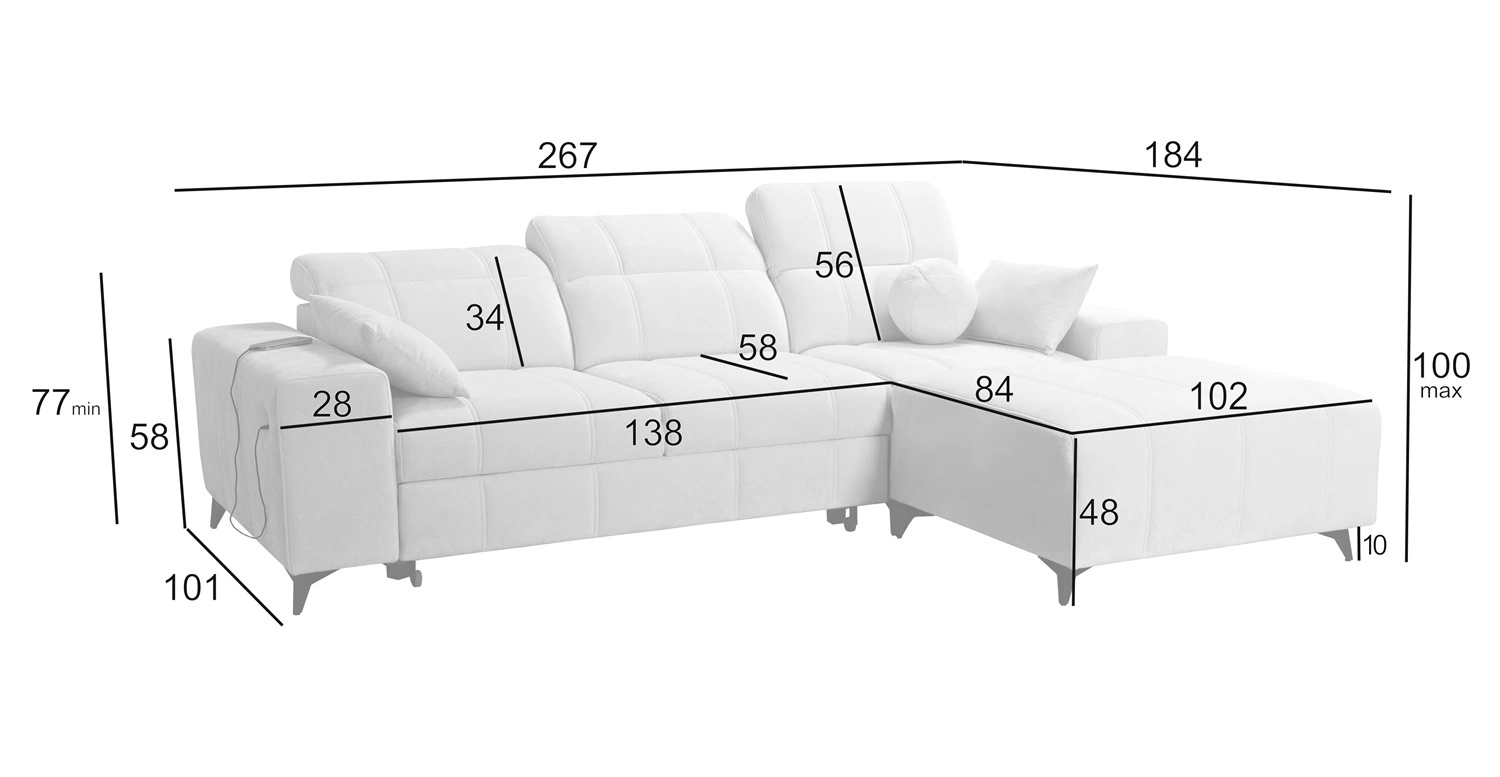 Rozměry nábytku umožní vyplnění prostoru v prostorném obývacím pokoji nebo zasedací místnosti. Šířka rohu 267 cm, maximální výška 100 cm a hloubka 184 cm. Spací plocha rohové jednotky je 129x209 cm. Výška sedadla nábytku je 48 cm a maximální výška opěradla je 56 cm. Vlnité pružiny a polyuretanová pěna T30 je materiál, z něhož je vyrobeno sedadlo rohu. Pevné opěradlo s nastavitelnými opěrkami hlavy umožní snadné adaptace úhel opěrek hlavy podle vašich preferencí a zaručí vám pohodlný odpočinek po dlouhém dni, který oceníte vy, vaši blízcí i hosté, kteří se na tuto jedinečnou rohovou pohovku posadí.