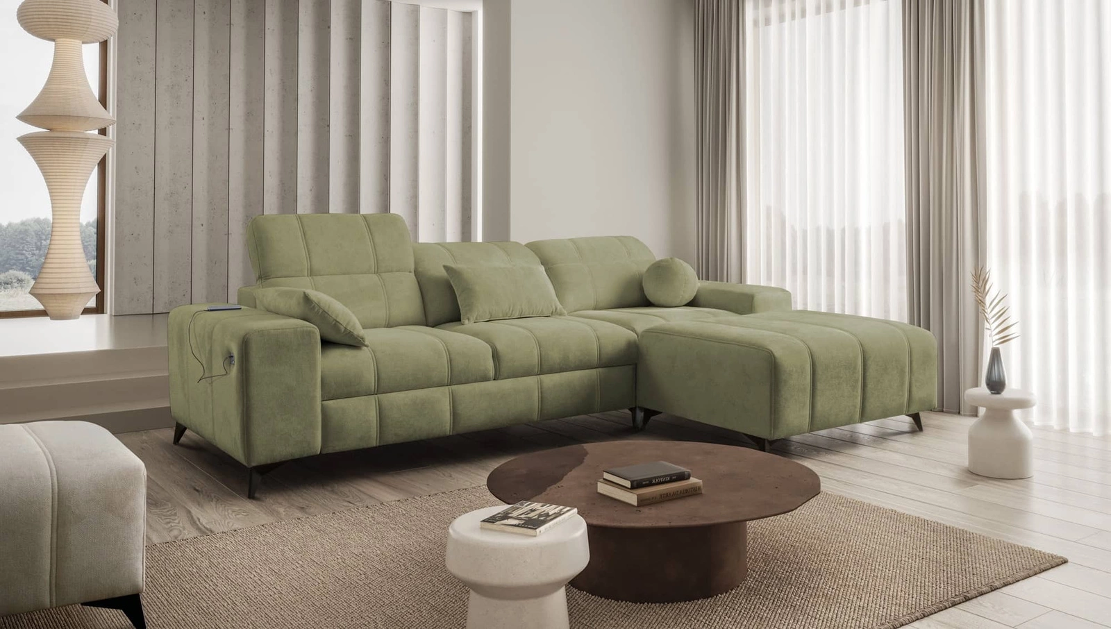 Rohová pohovka Penejos v olivově zelené barvě s nastavitelnými opěrkami hlavy je nádherný kus nábytku se zárukou nejvyššího pohodlí a funkčnosti.