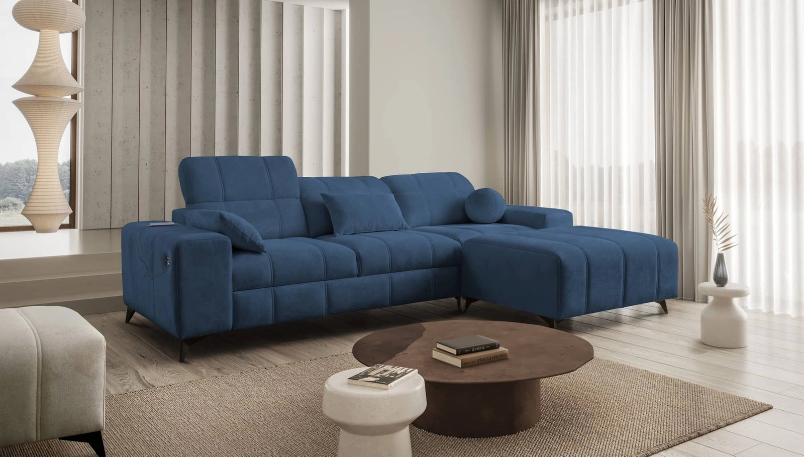 Rohová pohovka Penejos v modré barvě s nastavitelnými opěrkami hlavy je nádherný kus nábytku se zárukou nejvyššího pohodlí a funkčnosti.