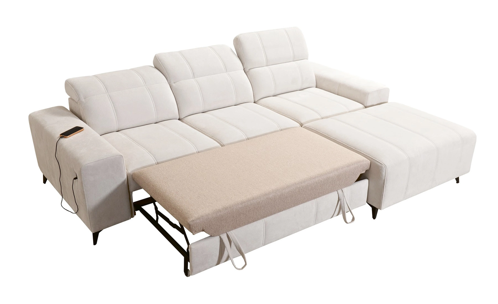 Mezi doplňky tohoto nábytku, které ocení všichni uživatelé, patří nádoba na lůžkoviny, funkce spaní a nabíjecí zásuvka USB na boku rohové skříně.