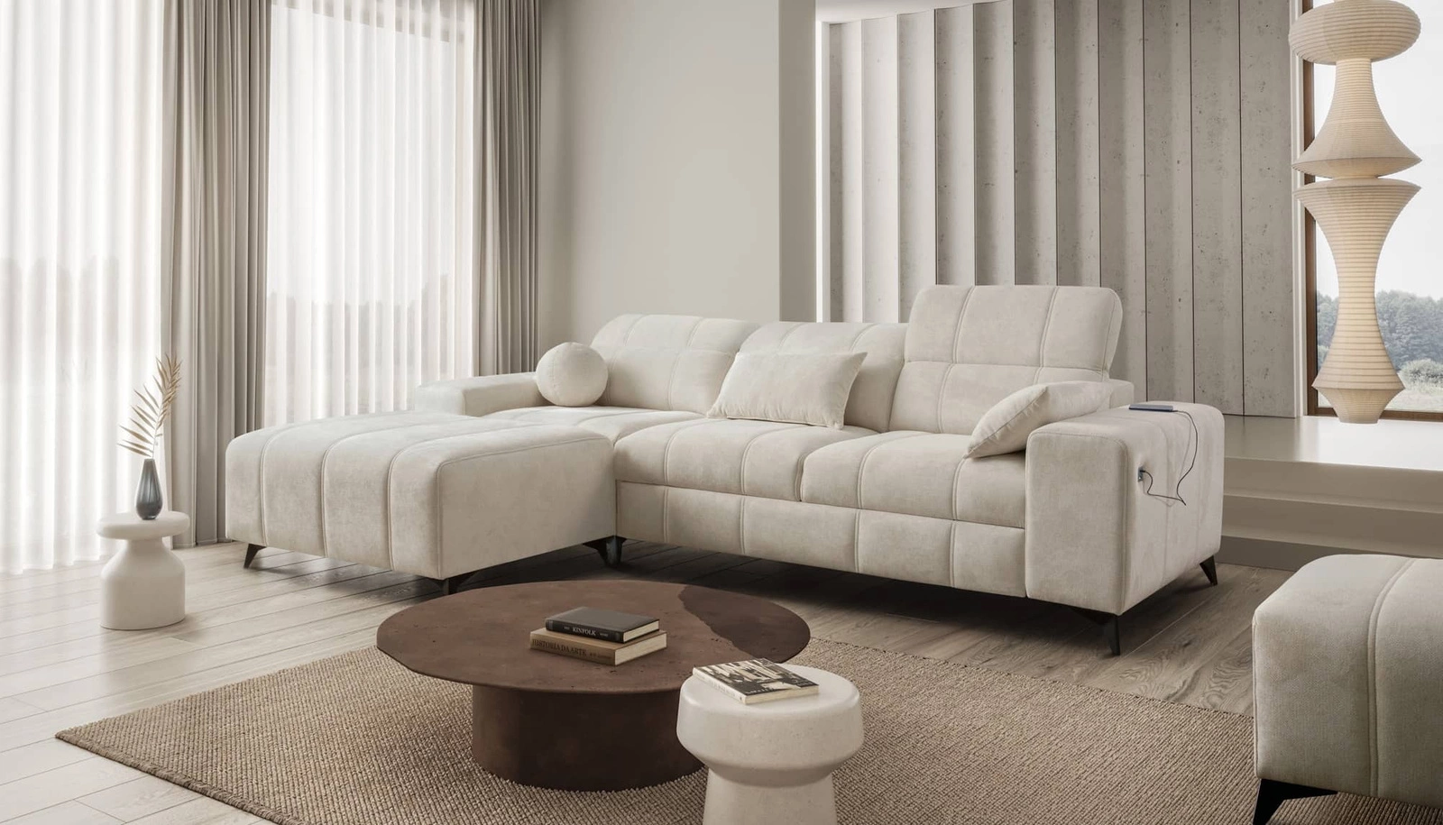 Rohová pohovka Penejos v krémové barvě s nastavitelnými opěrkami hlavy je nádherný kus nábytku se zárukou nejvyššího pohodlí a funkčnosti.