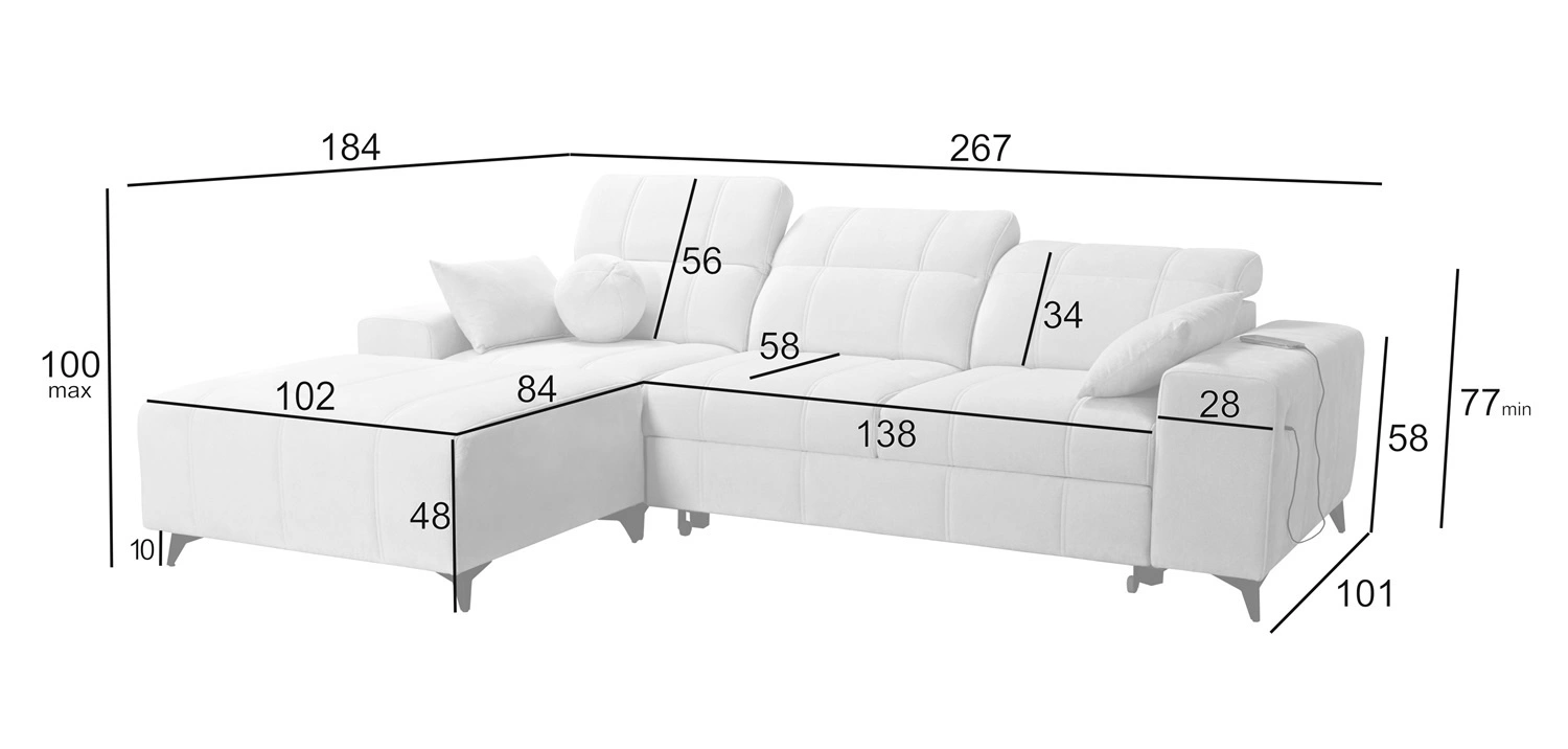 Rozměry nábytku umožní vyplnění prostoru v prostorném obývacím pokoji nebo zasedací místnosti. Šířka rohu 267 cm, maximální výška 100 cm a hloubka 184 cm. Spací plocha rohové jednotky je 129x209 cm. Výška sedadla nábytku je 48 cm a maximální výška opěradla je 56 cm. Vlnité pružiny a polyuretanová pěna T30 je materiál, z něhož je vyrobeno sedadlo rohu. Pevné opěradlo s nastavitelnými opěrkami hlavy umožní snadné adaptace úhel opěrek hlavy podle vašich preferencí a zaručí vám pohodlný odpočinek po dlouhém dni, který oceníte vy, vaši blízcí i hosté, kteří se na tuto jedinečnou rohovou pohovku posadí.