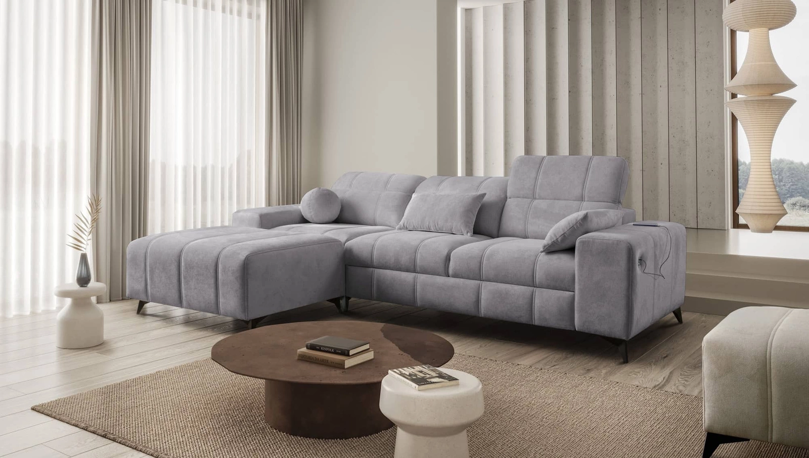 Mezi doplňky tohoto nábytku, které ocení všichni uživatelé, patří nádoba na lůžkoviny, funkce spaní a nabíjecí zásuvka USB na boku rohové skříně.