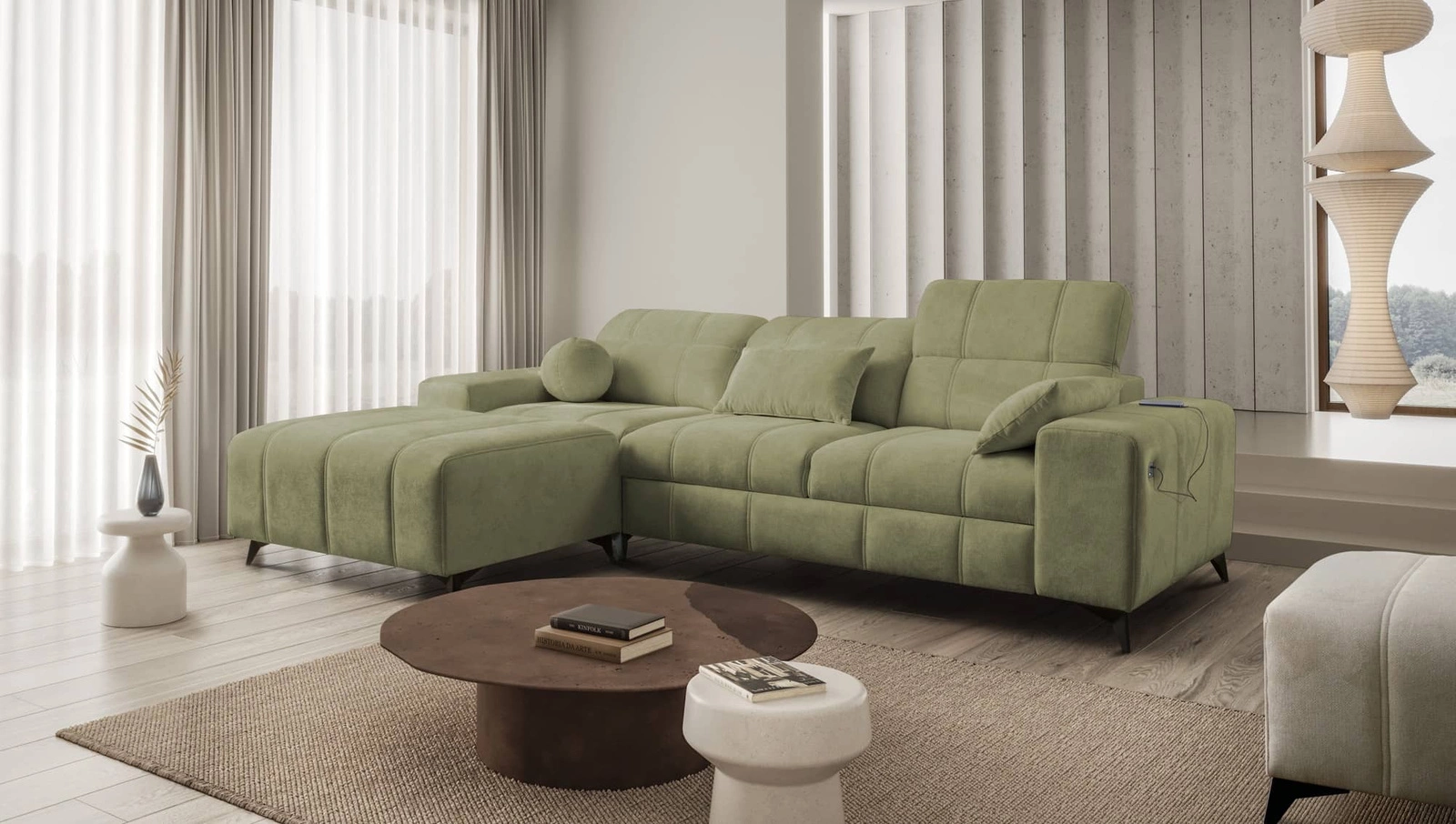 Rohová sedačka s funkcí spaní Penejos olivová levá elegantní rohová sedačka s úložným prostorem na lůžkoviny pohodlné nastavitelné opěrky hlavy