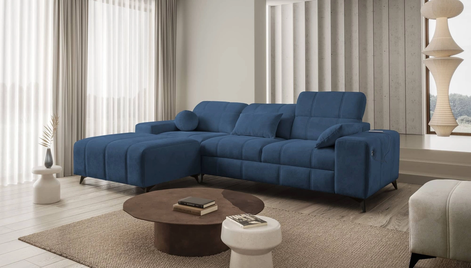 Rohová pohovka Penejos v modré barvě s nastavitelnými opěrkami hlavy je nádherný kus nábytku se zárukou nejvyššího pohodlí a funkčnosti.