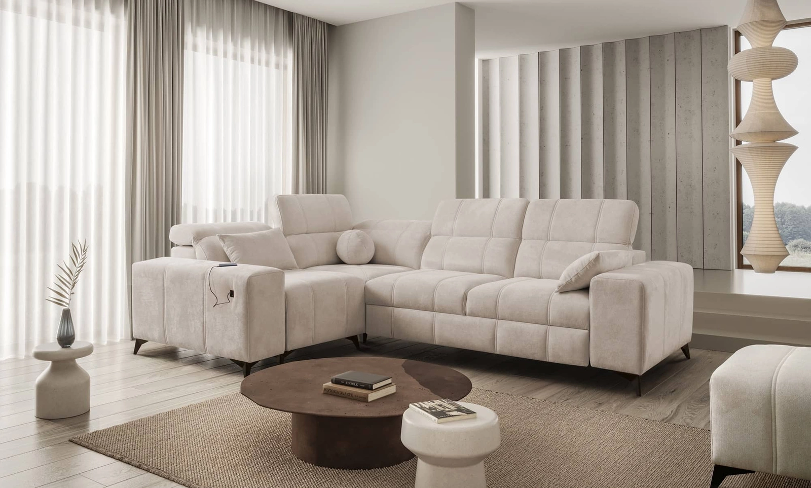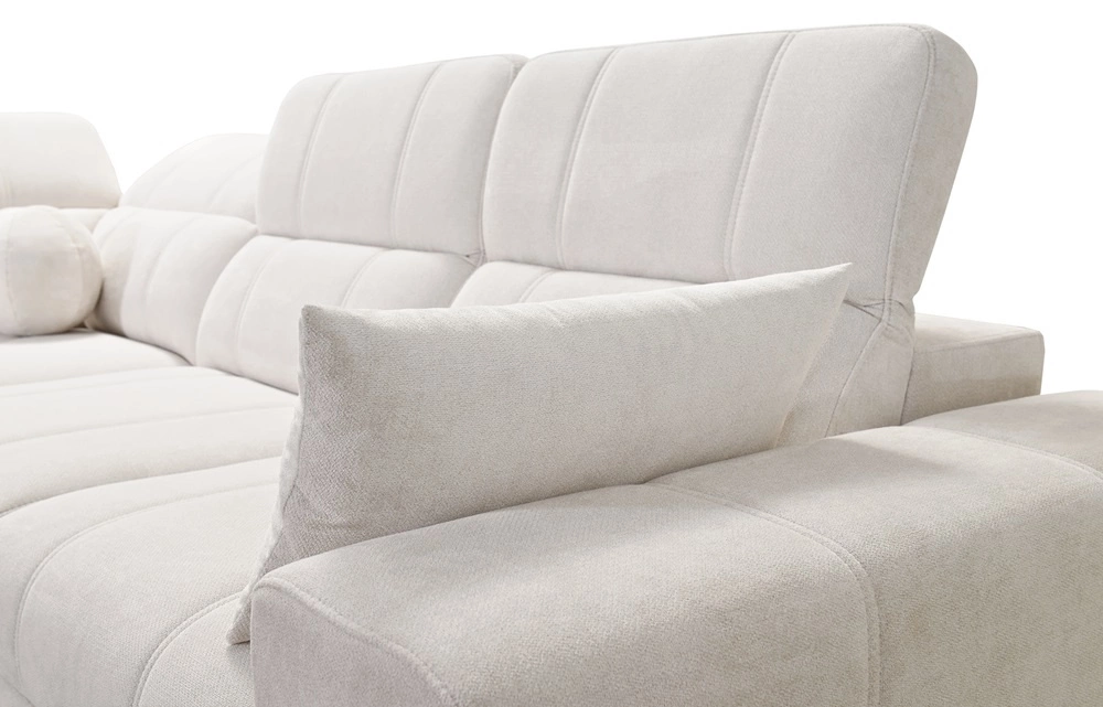 Rohová pohovka Penejos II v béžové barvě s nastavitelnými opěrkami hlavy je nádherný kus nábytku se zárukou nejvyššího pohodlí a funkčnosti.