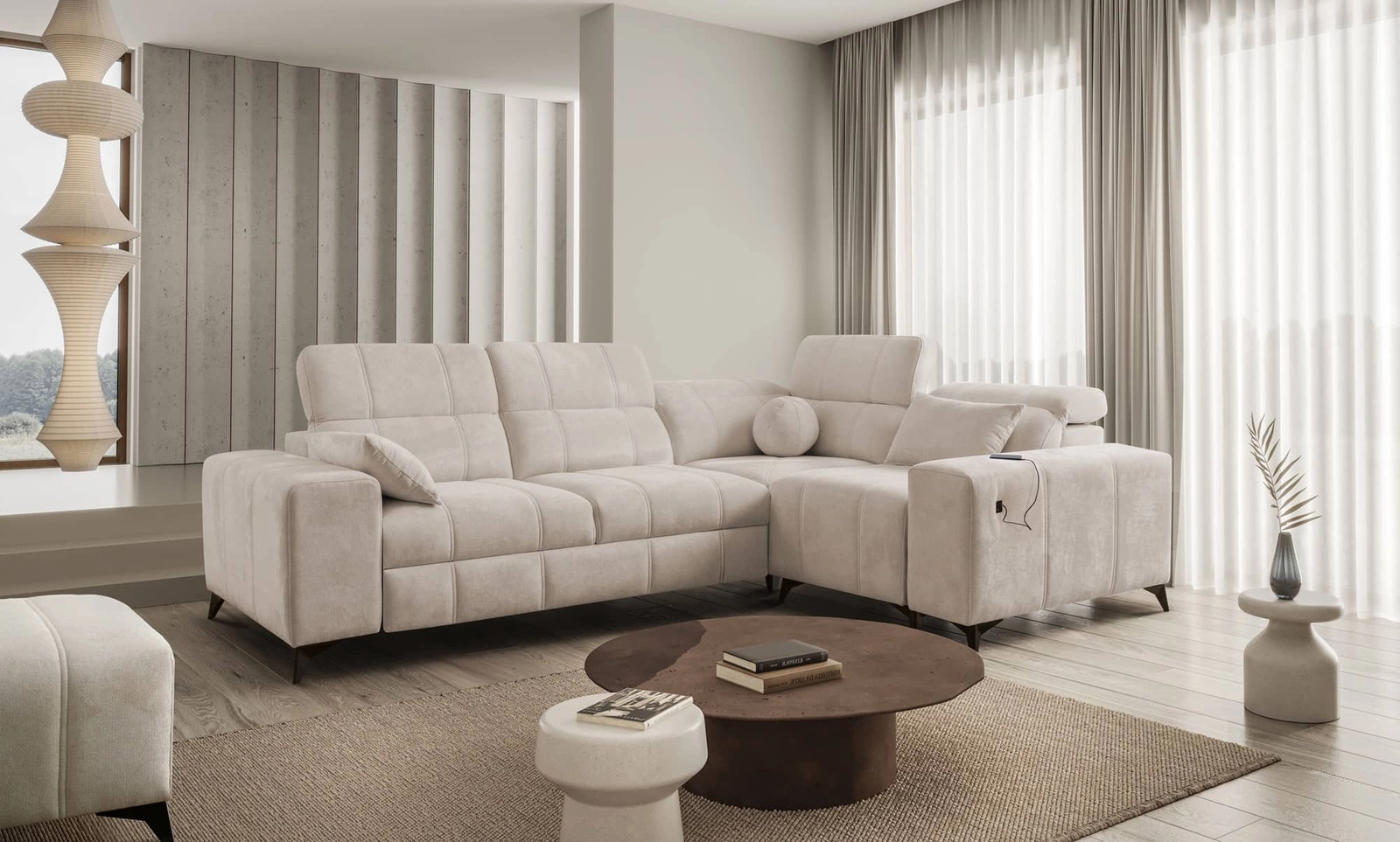 Rohová pohovka Penejos II v béžové barvě s nastavitelnými opěrkami hlavy je nádherný kus nábytku se zárukou nejvyššího pohodlí a funkčnosti.