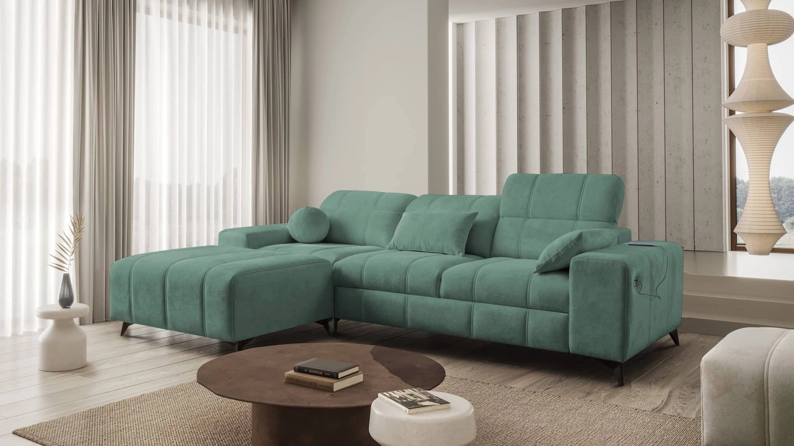 Rohová pohovka Penejos v zelené barvě s nastavitelnými opěrkami hlavy je nádherný kus nábytku se zárukou nejvyššího pohodlí a funkčnosti.