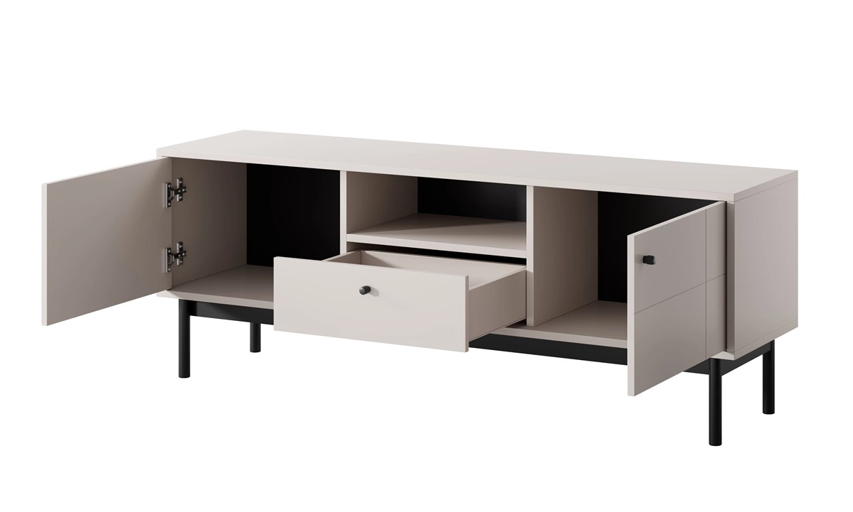 TV skříňka Modesta je minimalistický kousek kombinující prvky japonské estetiky s jednoduchými liniemi skandinávského designu. Módní béžová v kašmírovém odstínu a jemné frézovaná čela dodávají nábytku eleganci a vytvářejí výraznou dekoraci. Stylovou tečkou na čelech skříně RTV jsou malé skříňky černé rukojeti z kovu, které kromě své primární funkce dodávají nábytku jedinečný styl. Jednoduchá konstrukce a jedinečný design televizní skříňky z kolekce Modesta dodají místnosti lehkou a útulnou atmosféru.