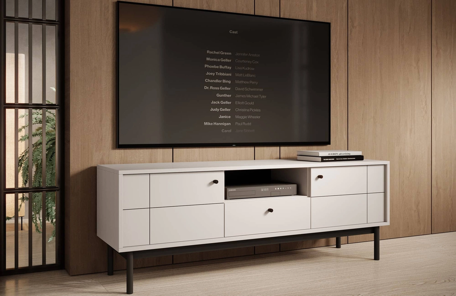 Skříň RTV je vyrobena z vysoce kvalitní laminované desky tloušťka 16 mm, která je odolná vůči vnějším vlivům, jako jsou otlaky, nárazy a nešťastné škrábance. Recess uprostřed televizní skříňky je skvělé místo pro rtv zařízení nebo herní konzoli. Dřevěné nohy natřené černou barvou přidat zvláštní nádech a zároveň zachovat funkčnost.