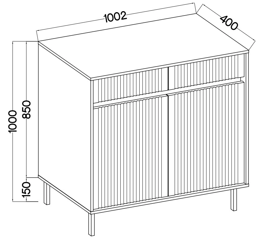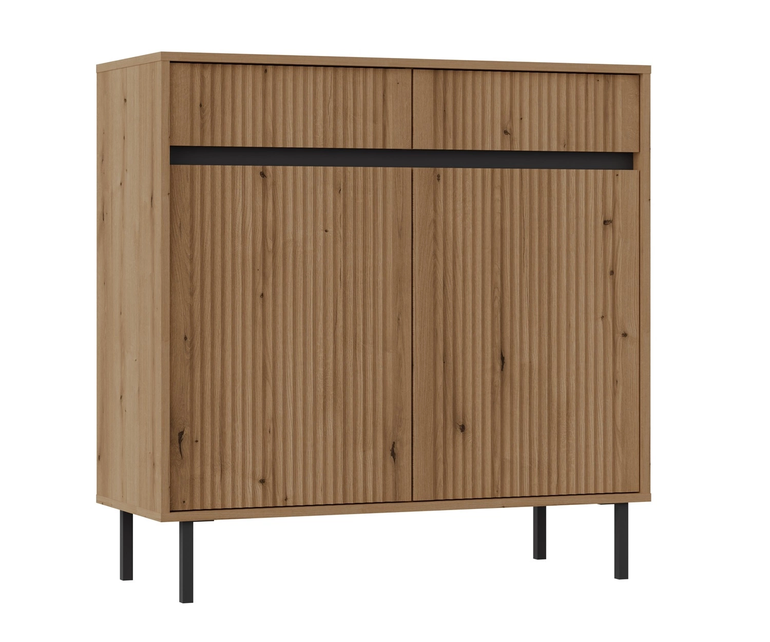 Žlábkovaná čela v barvě dubu jsou vyrobena z materiálu mDF desky. Tělo komody je vyrobeno z vysoce kvalitní laminované desky tloušťka 16 mm, která je odolná vůči vnějším vlivům, jako jsou otlaky, nárazy a nešťastné škrábance. Kov černé nohy přidat zvláštní nádech a zároveň zachovat funkčnost.
