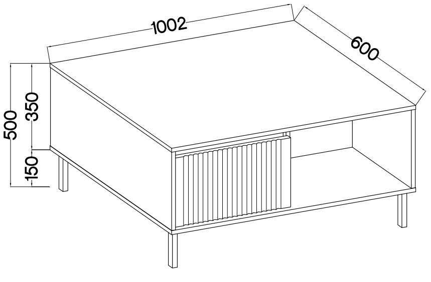 Drážkovaná čela v barvě dubu byly vyrobeny z mDF. Tělo tabulky byl vyroben z vysoce kvalitní laminovaná deska tloušťka 16 mm, který je odolný vůči vnějším vlivům, jako jsou otlaky, nárazy a nešťastné škrábance. Otevřená police poskytuje další prostor pro vaše oblíbené knihy nebo časopisy. Kovové nohy v černé barvě dodávají vizuální lehkost při zachování funkčnosti.