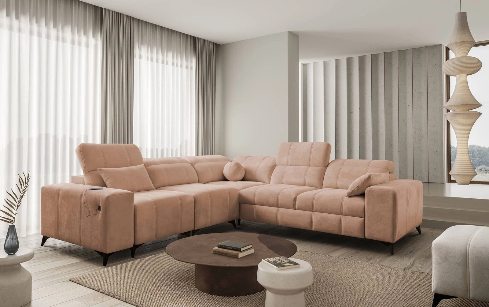 Rohová pohovka Penejos III v lososové barvě s nastavitelnými opěrkami hlavy je nádherný kus nábytku se zárukou nejvyššího pohodlí a funkčnosti.