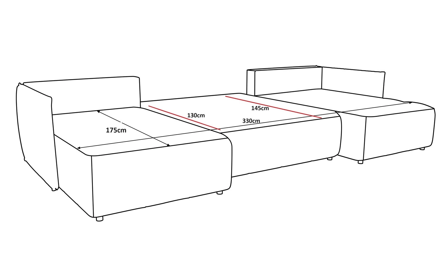 Díky svým rozměrům a široké funkčnosti je rohová pohovka s funkcí spaní ideální jako rohová pohovka do obývacího pokoje nebo jako rozkládací rohová pohovka do pokoje pro hosty. Rohová pohovka s funkcí spaní je také skvělou alternativou k posteli v pokoji pokoj pro mladé. Šířka rohu 342 cm, výška 88 cm a hloubka 190 cm. Spací plocha rohové jednotky je 145x330 cm. Výška sedadla nábytku je 44 cm, a výška opěradla je 44 cm. Vlnité pružiny a polyuretanová pěna T30 je materiál, z něhož je vyrobeno sedadlo rohu. Soft opěrné polštáře zajistí vysokou úroveň pohodlí při každodenním odpočinku, což oceníte vy i vaši hosté, kteří se na tuto jedinečnou rohovou sedačku posadí.