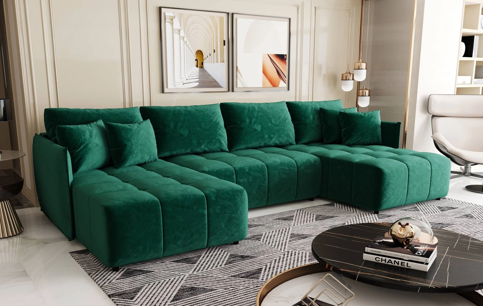 Rohová pohovka Oroso U v lahvově zelené barvě je atraktivní kus nábytku, který se bude snadno vyjímat v každé místnosti vašeho domova.