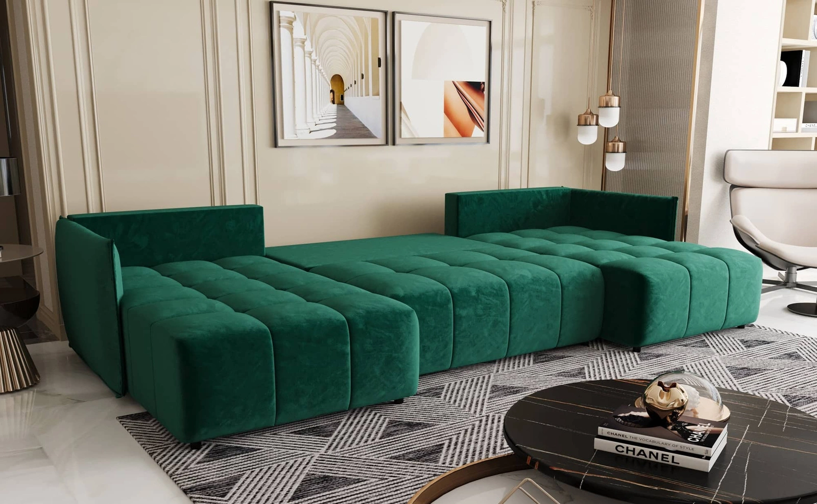 Rozkládací pohovka Oroso U láhev zelený kontejner na lůžkoviny sametová tkanina s hydrofobním povlakem dekorativní prošívání