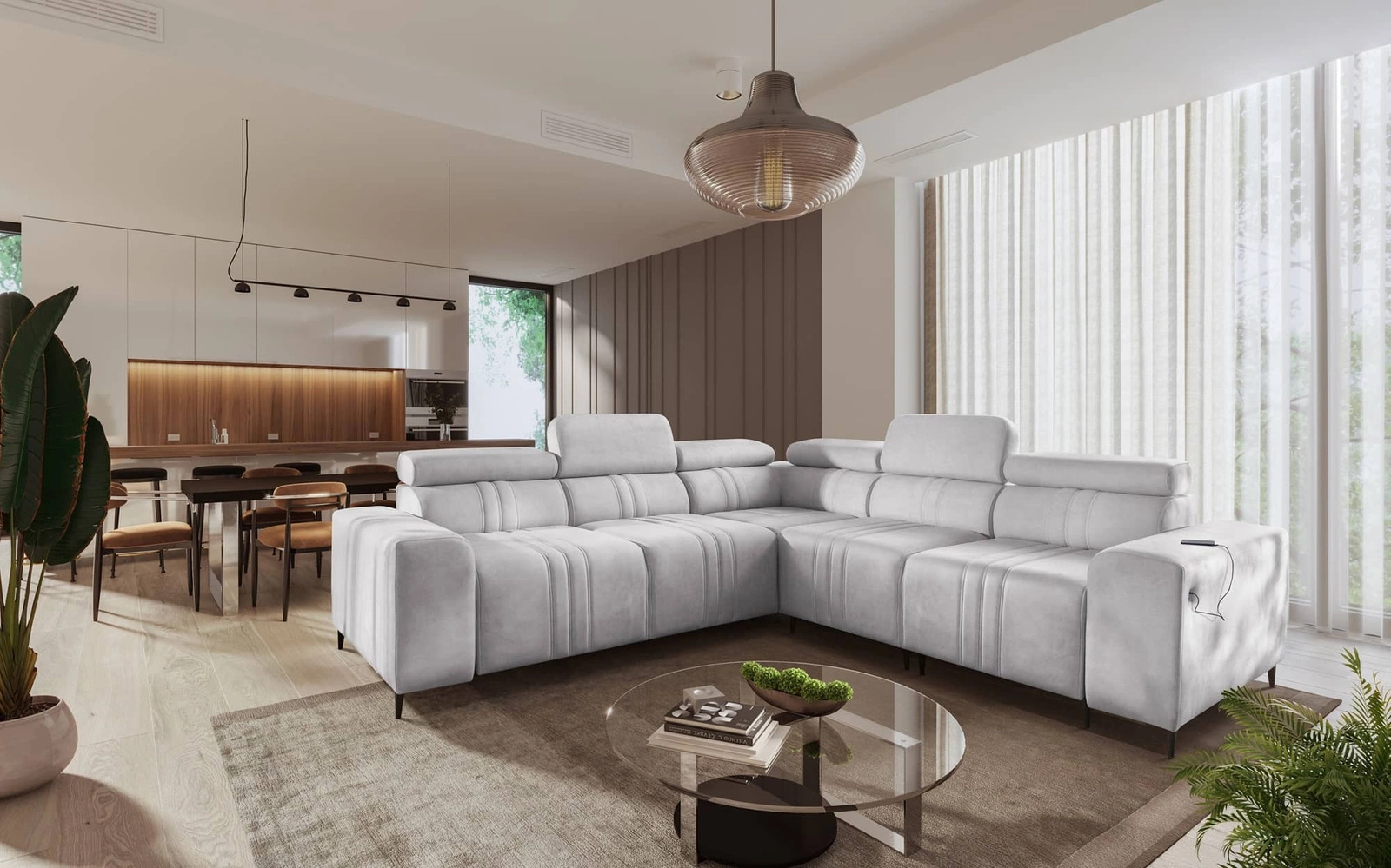 Mezi doplňky tohoto nábytku, které ocení všichni uživatelé, patří dva kontejnery na lůžkoviny, nastavitelné opěrky hlavy a nabíjecí zásuvka USB na boku rohové skříně.