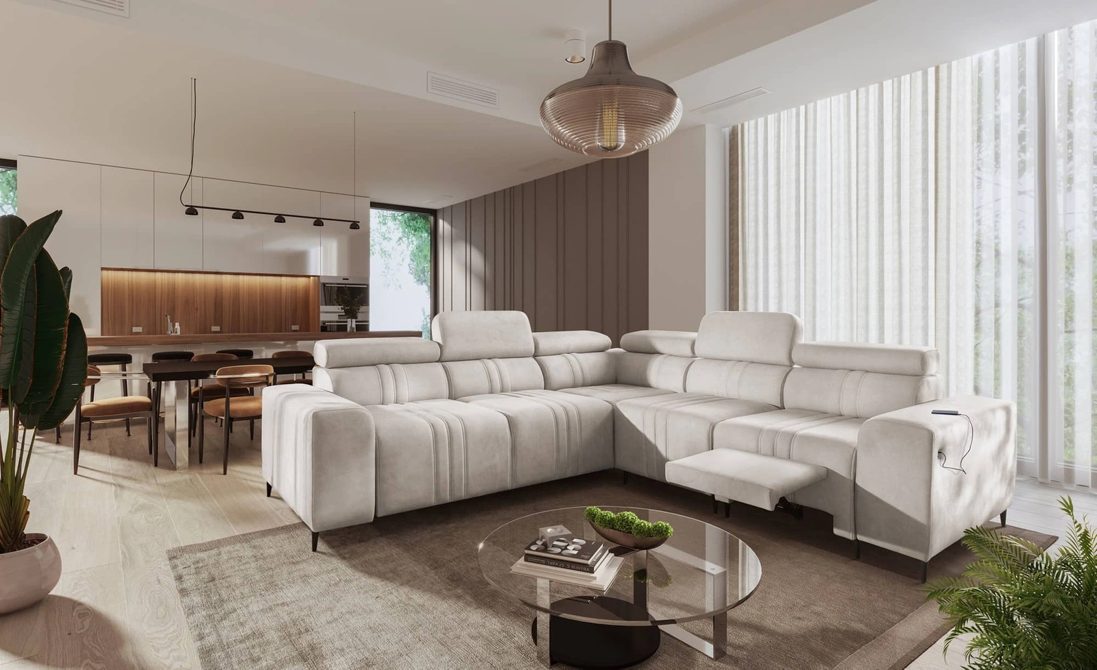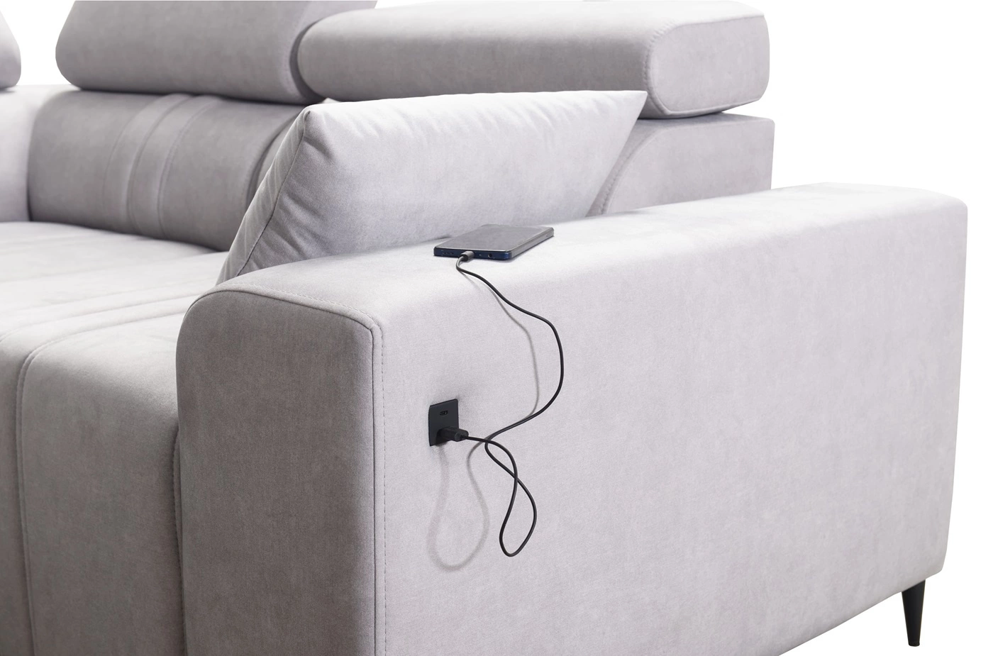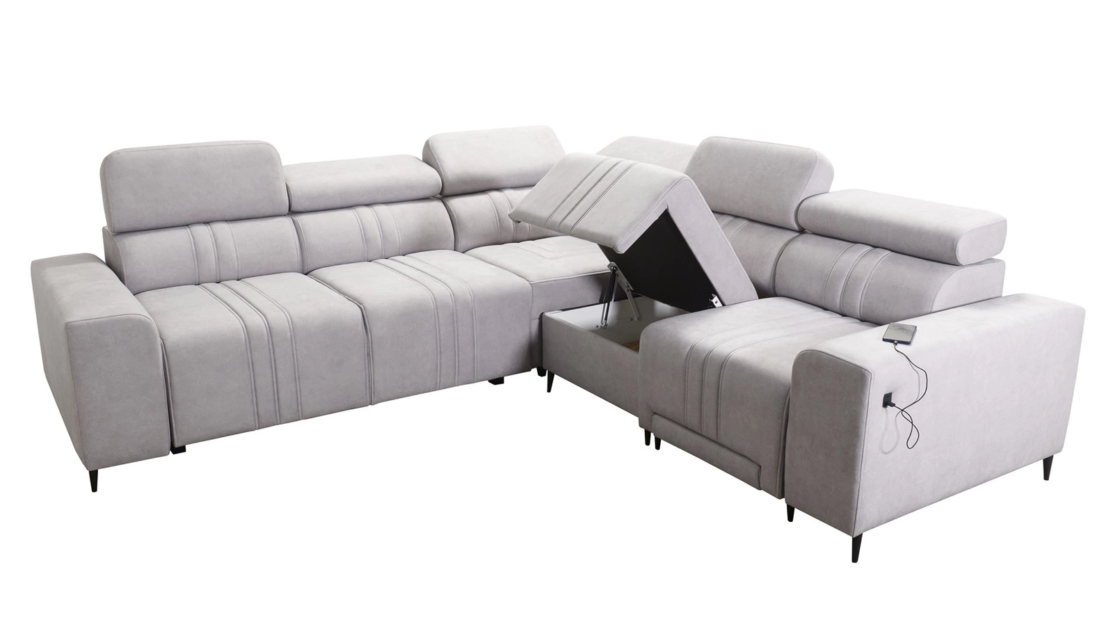 Mezi doplňky tohoto nábytku, které ocení všichni uživatelé, patří výsuvná podnožka, nastavitelné opěrky hlavy, nádoba na lůžkoviny a nabíjecí zásuvka USB v boční části rohové jednotky.