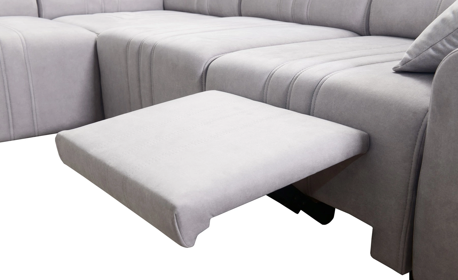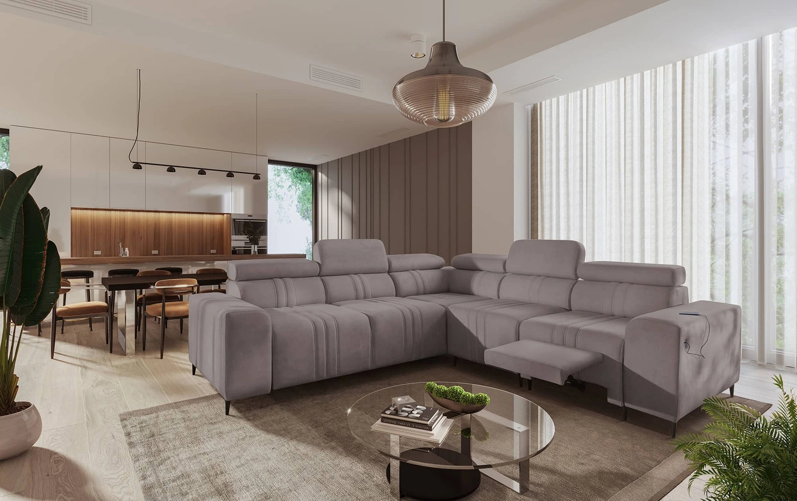 Mezi doplňky tohoto nábytku, které ocení všichni uživatelé, patří výsuvná podnožka, nastavitelné opěrky hlavy, nádoba na lůžkoviny a nabíjecí zásuvka USB v boční části rohové jednotky.