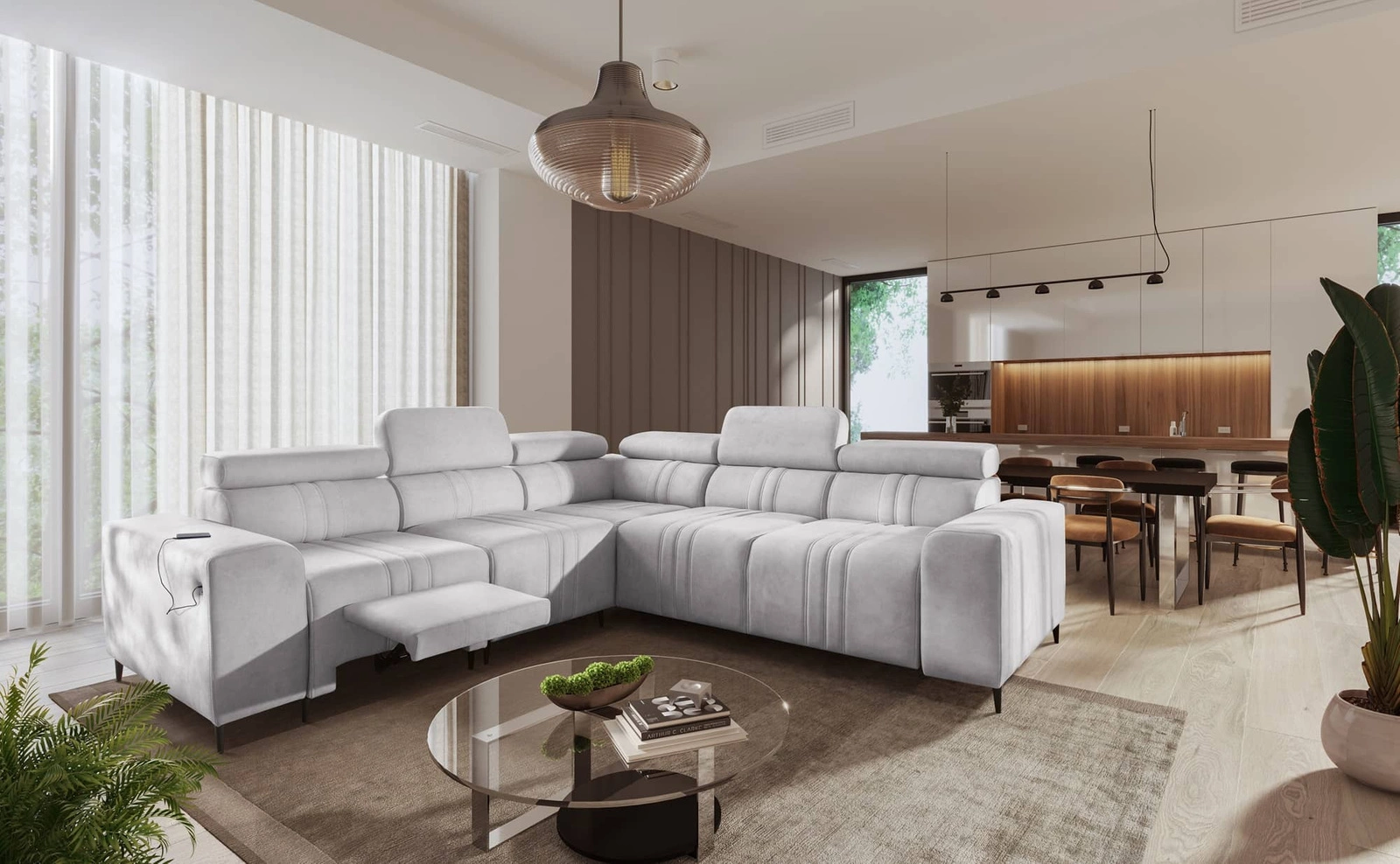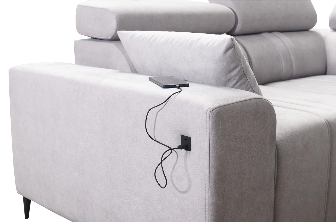 Mezi doplňky tohoto nábytku, které ocení všichni uživatelé, patří výsuvná podnožka, nastavitelné opěrky hlavy, nádoba na lůžkoviny a nabíjecí zásuvka USB v boční části rohové jednotky.