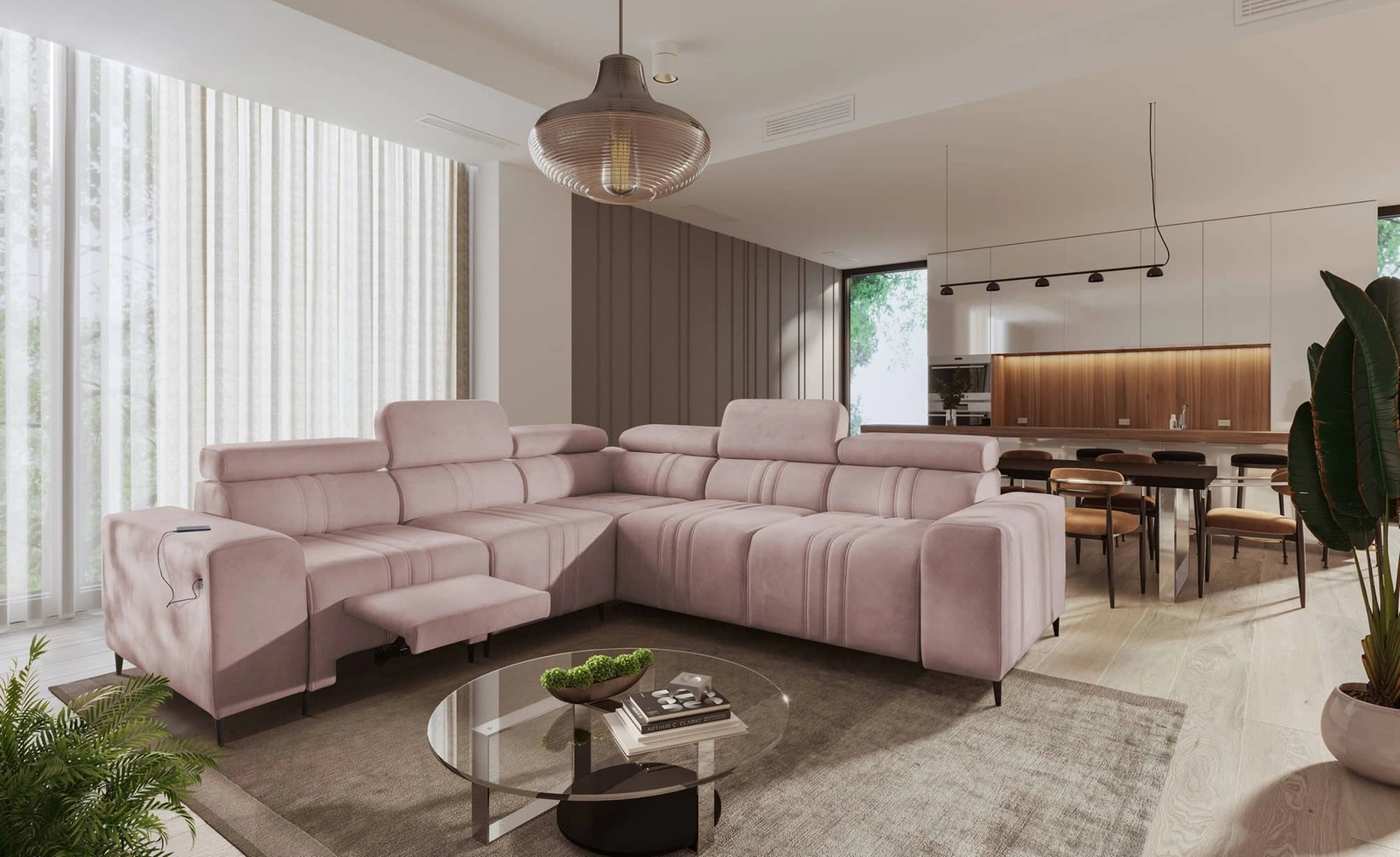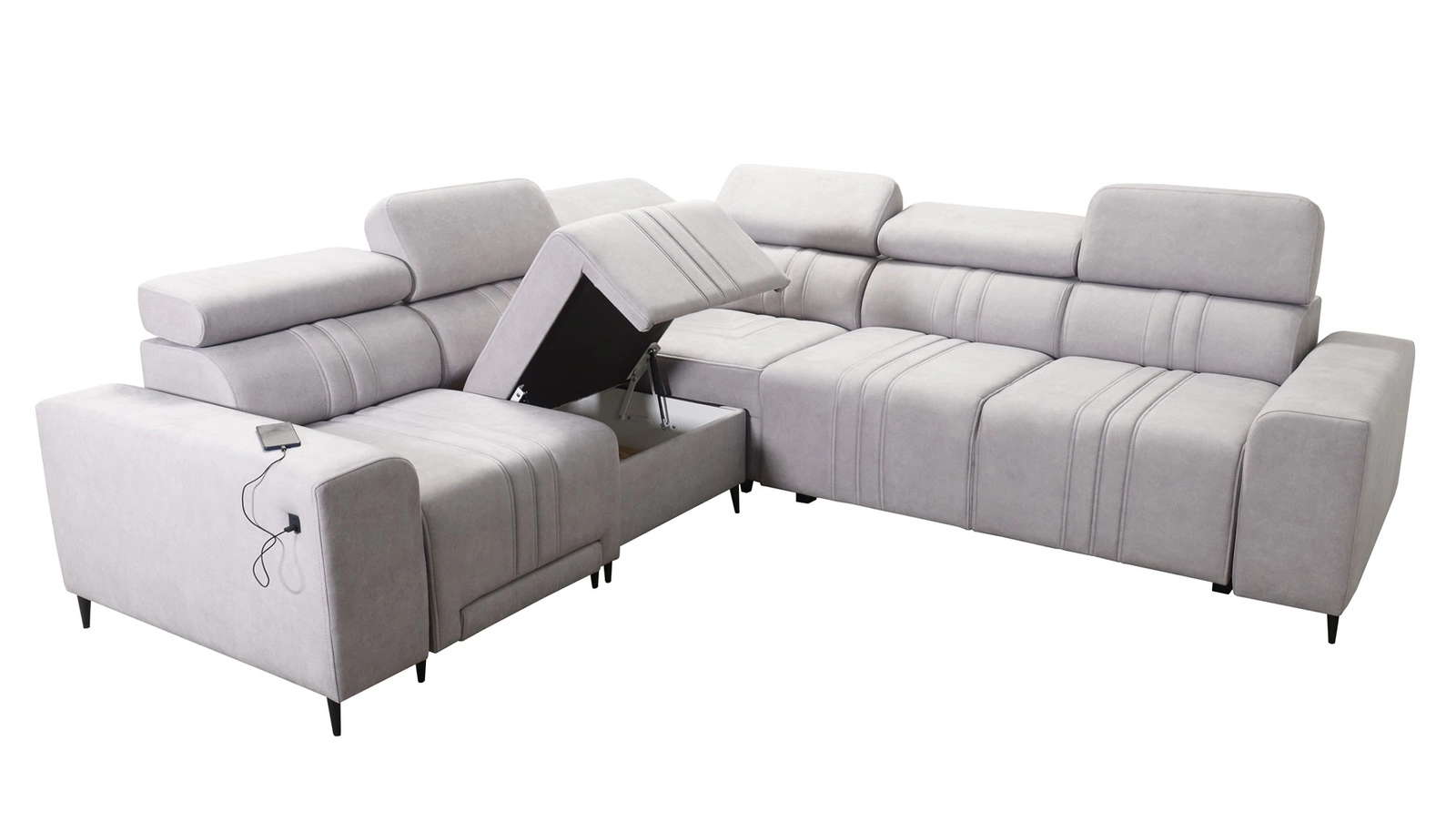 Mezi doplňky tohoto nábytku, které ocení všichni uživatelé, patří výsuvná podnožka, nastavitelné opěrky hlavy, nádoba na lůžkoviny a nabíjecí zásuvka USB v boční části rohové jednotky.