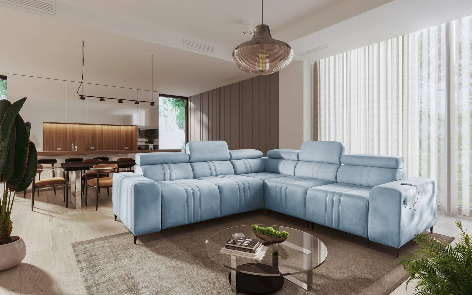 Rohová pohovka Castel III v modré barvě s nastavitelnými opěrkami hlavy je mimořádně elegantní kus nábytku se zajímavou povrchovou úpravou.