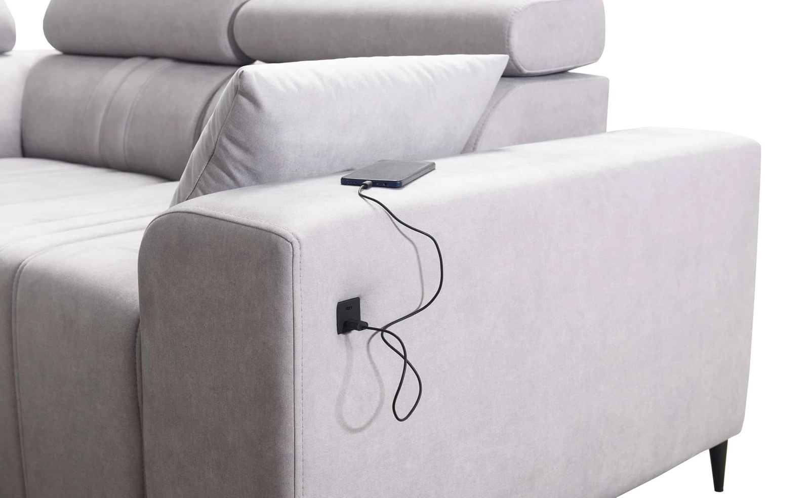 Mezi doplňky tohoto nábytku, které ocení všichni uživatelé, patří dva kontejnery na lůžkoviny, nastavitelné opěrky hlavy a nabíjecí zásuvka USB na boku rohové skříně.